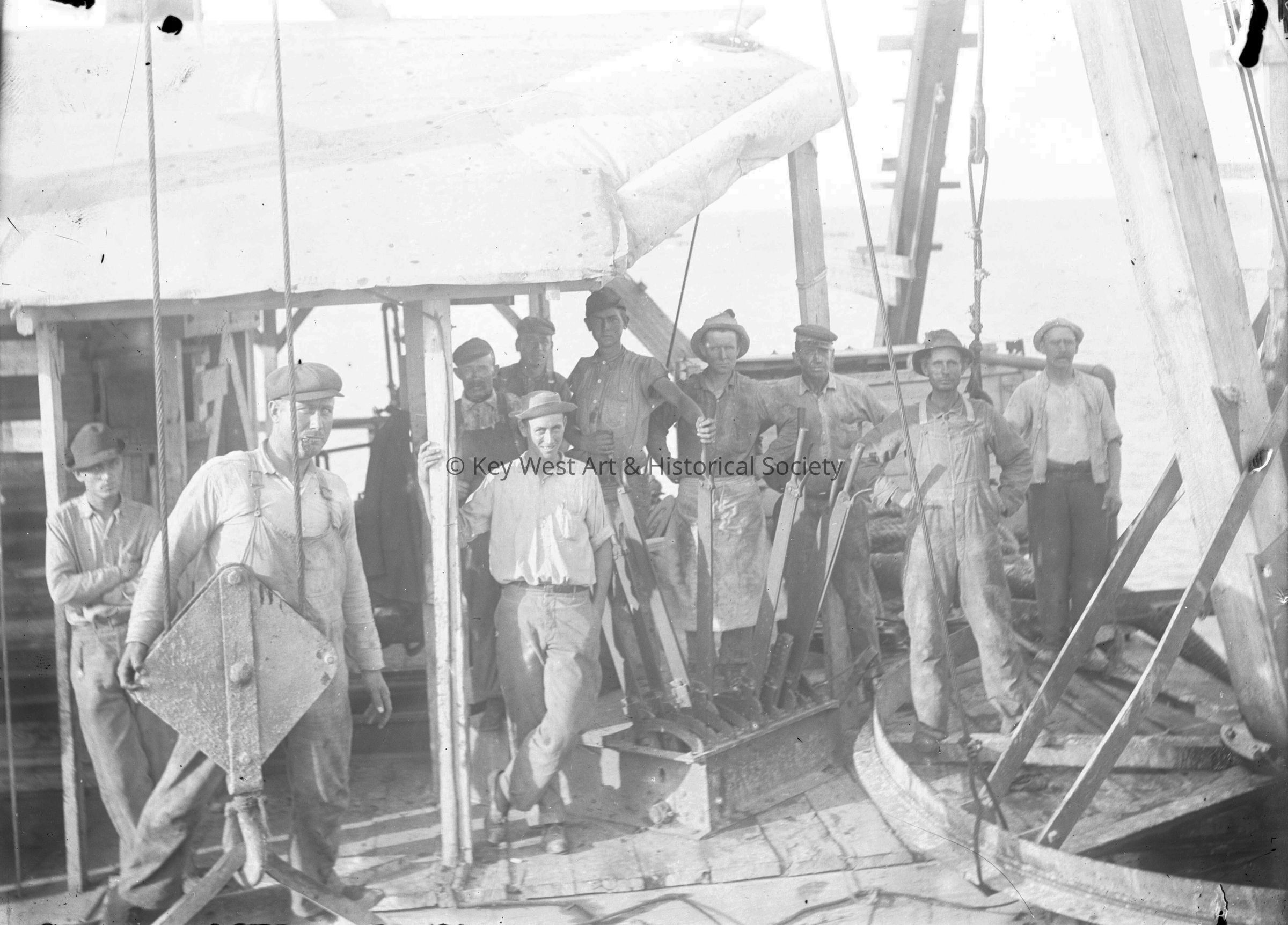 Black and white dry plate glass negative of the cement barge crew employed by the Florida East Coast Railway during the construction of Seven Mile Bridge on the Overseas Railway.