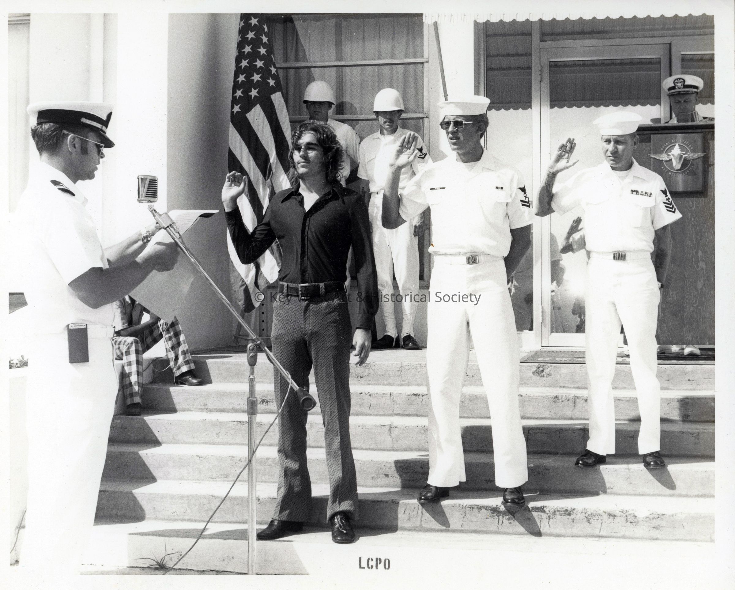 Black and white photograph of a swearing in ceremony at Naval Air Station Key West, possibly related to lead chief petty office rank.