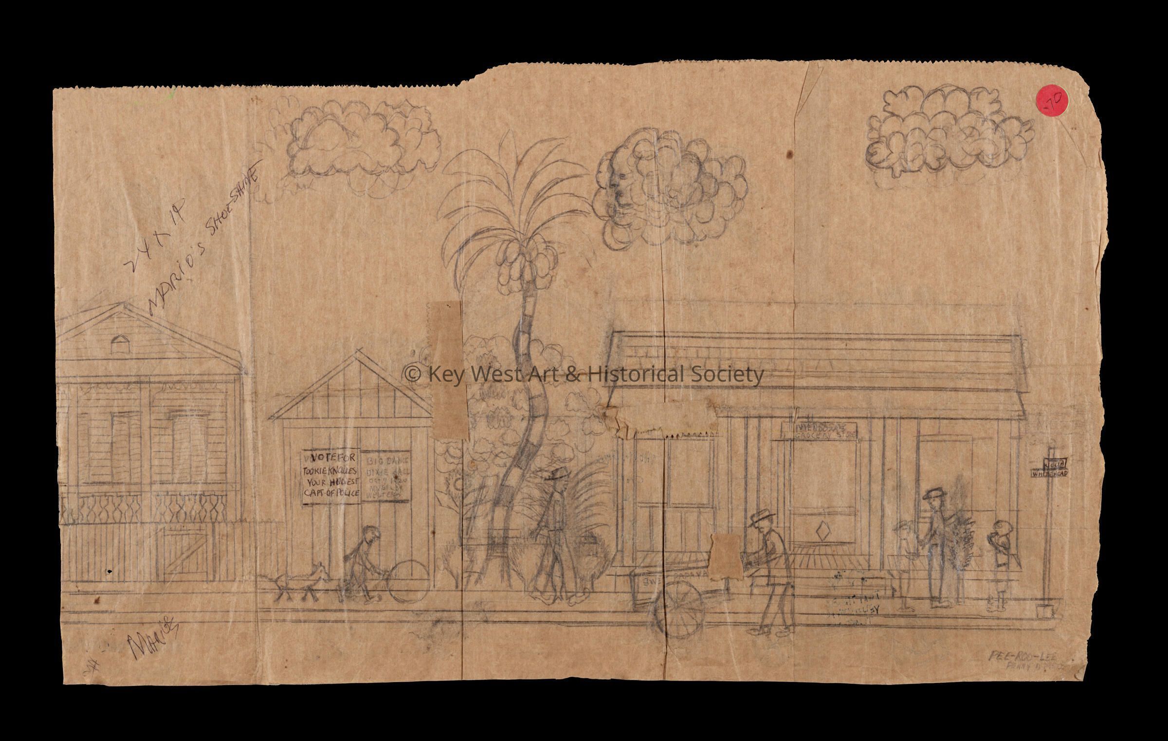 Pencil sketch on an unfolded paper bag by Mario Sanchez depicting the Waterloo Cafe and Mario's Shoe Shine Stand alongside the building.Type of Drawing