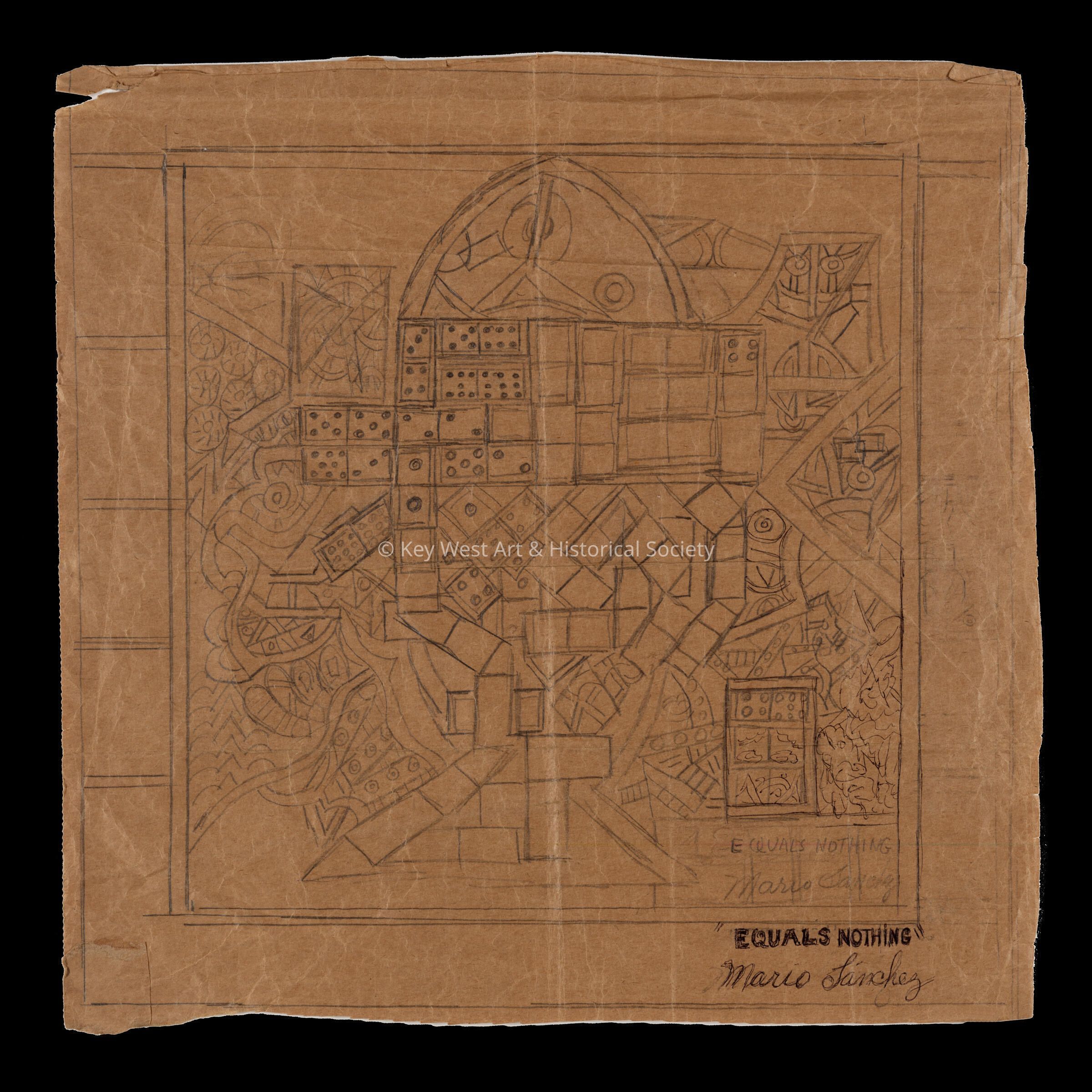Pencil drawing on an unfolded paper bag by Mario Sanchez depicting a geometric abstraction featuring dominoes.  There is an unfinished sketch on the verso depicting houses with the Key West Lighthouse in the background.Type of Drawing