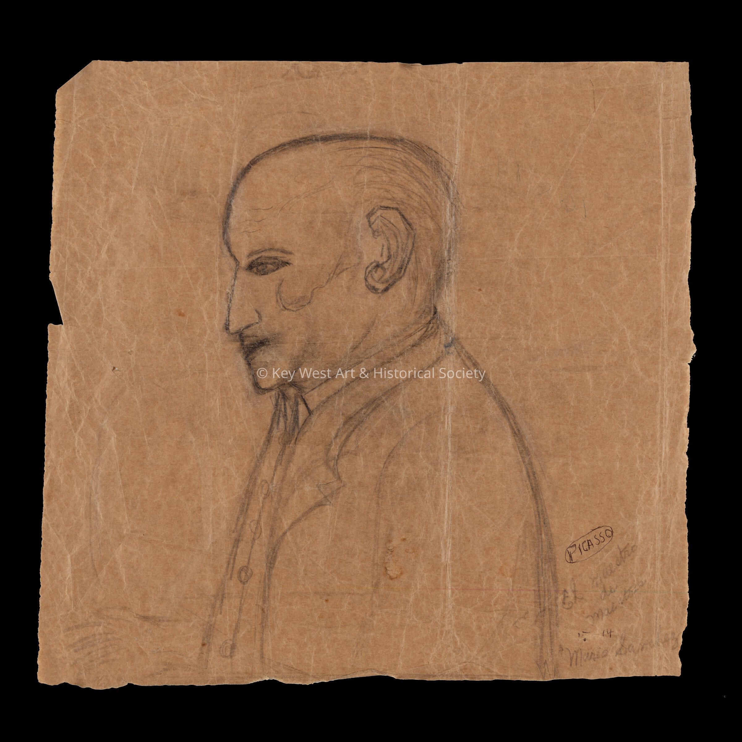 Pencil sketch on an unfolded paper bag by Mario Sanchez depicting a portrait of the Spanish artist Pablo Picasso.Type of Drawing