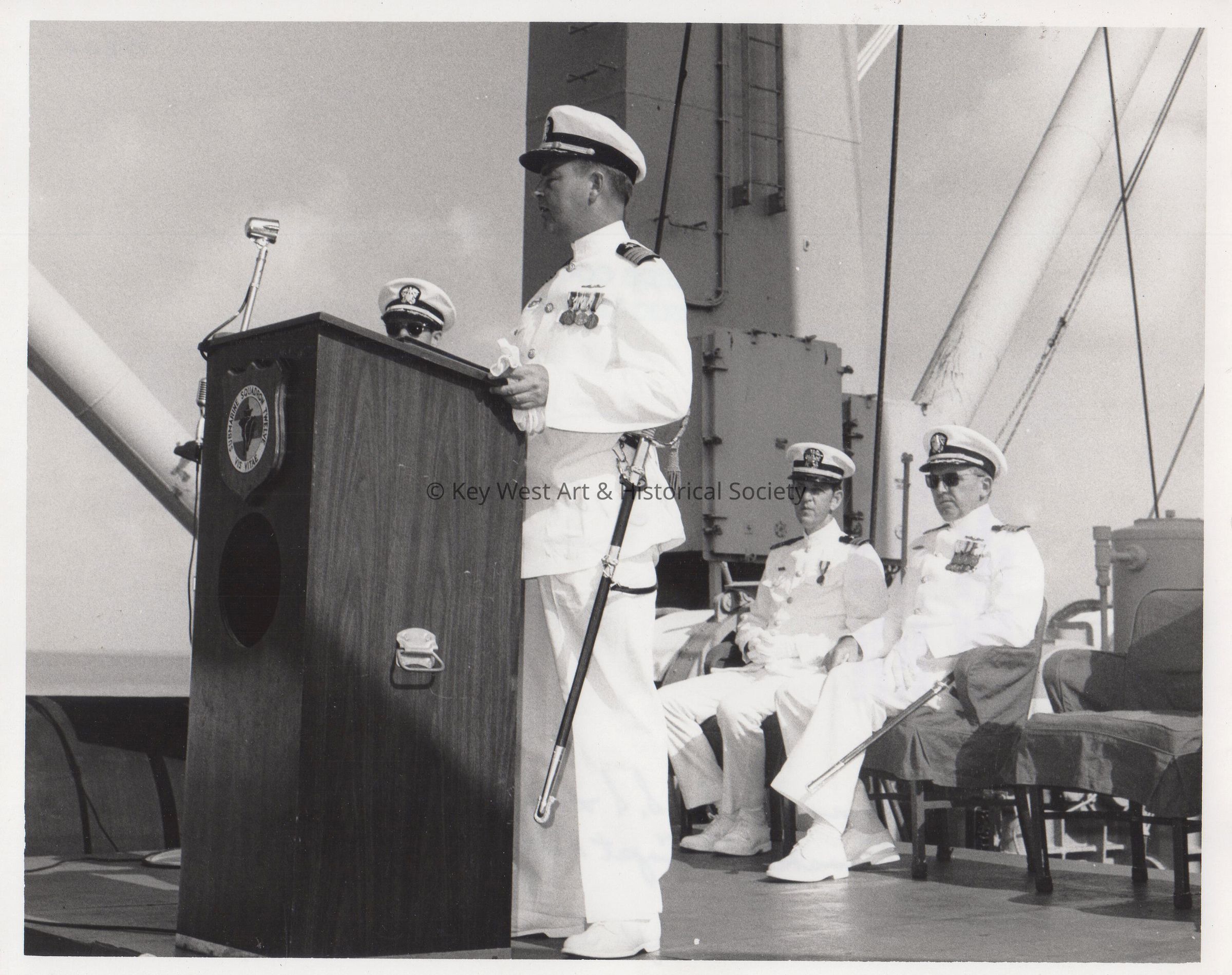 Black and white photograph taken during the Change of Command for USS HOWARD W. GILMORE (AS-16) with Captain Ronetowski and Captain Bryan and Naval Station Key West.