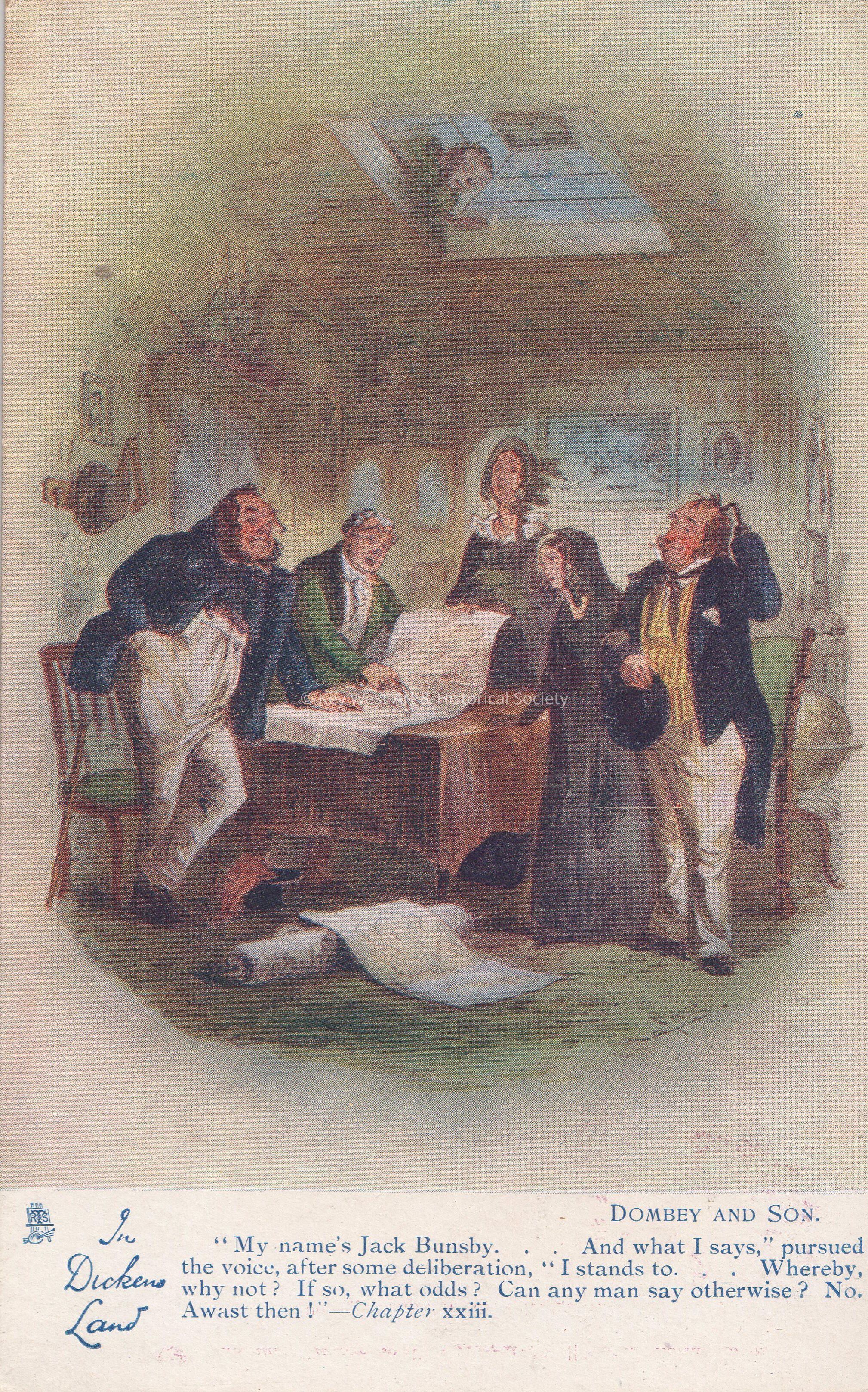 Postcard depicting a man looking through a skylight at a group of people studying papers on a desk. The caption reads, ‘In Dickens Land, Dombey and Son, My name’s Jack Bunsby. . . And what I says, pursued the voice, after some deliberation, I stands to . . . Whereby, why not? If so, what odds? Can any man say otherwise? No, Awast them!---Chapter xxiii.’Collection