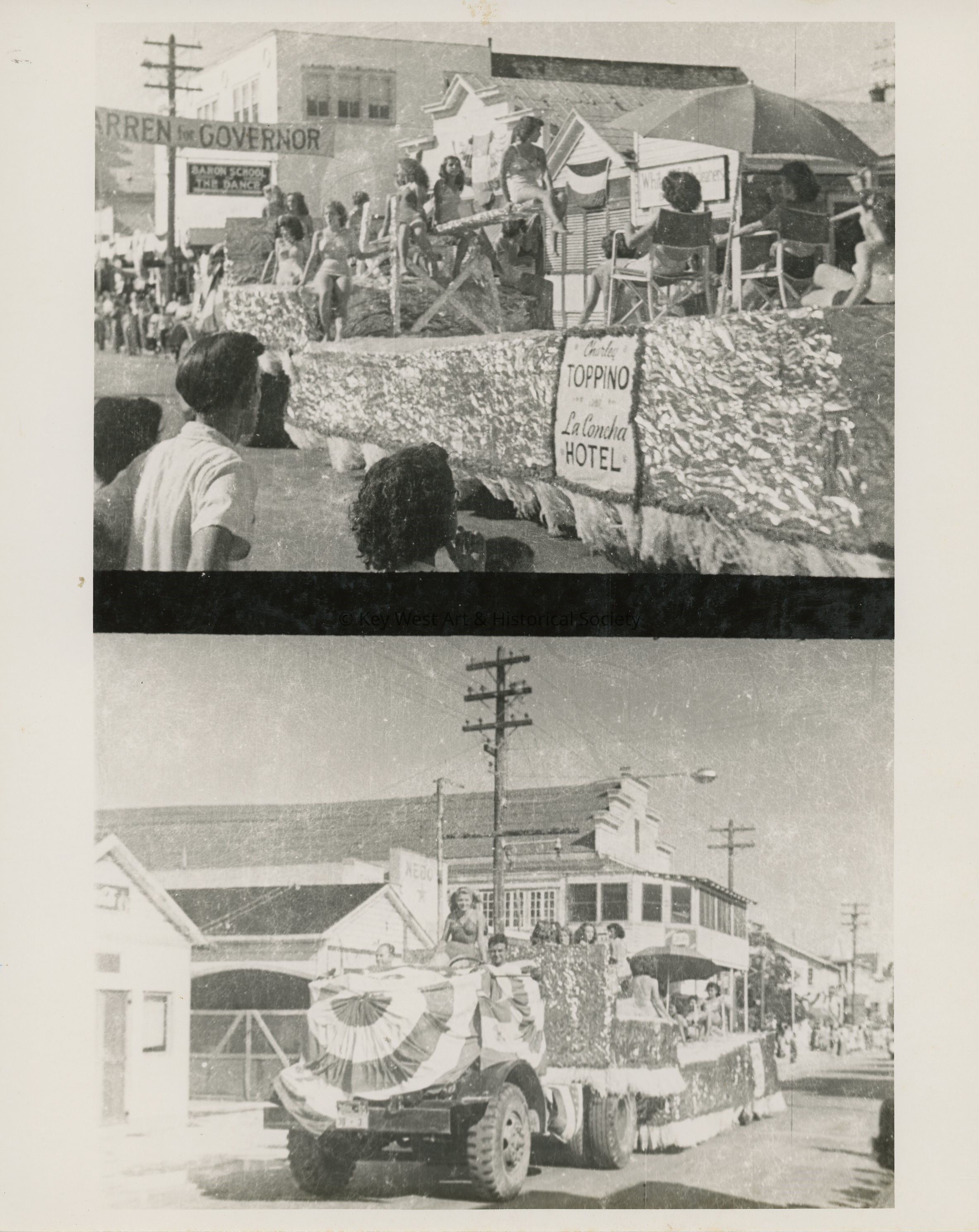 Black and white photograph of the Charley Toppino and La Concha Hotel parade float possibly on Duval Street.