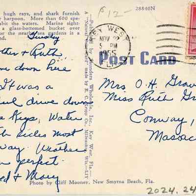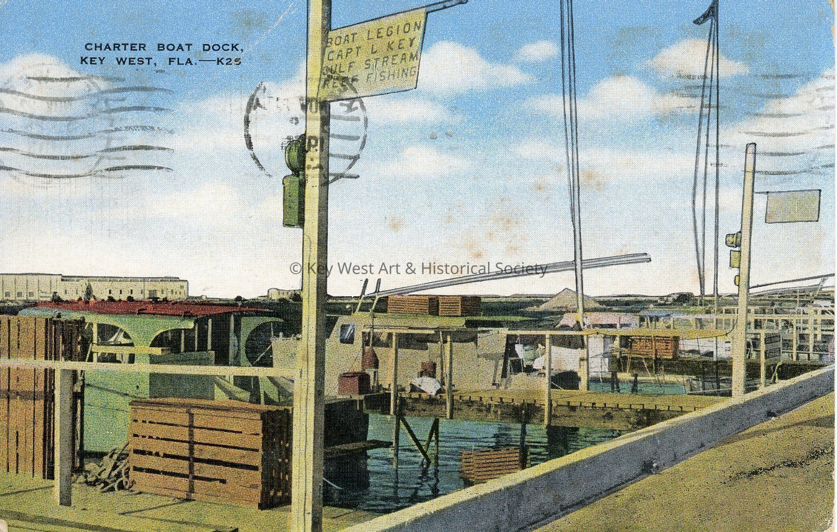Postcard depicting a charter boat dock in Key West, Florida. "Giant jewfish, huge rays, and shark furnish sport on hook or harpoon. More than 600 species of fish inhabit the waters. Marine sightseeing through the glass-bottomed bucket over the coral reefs or the nearby sea gardens is a trip to fairy island."Collection