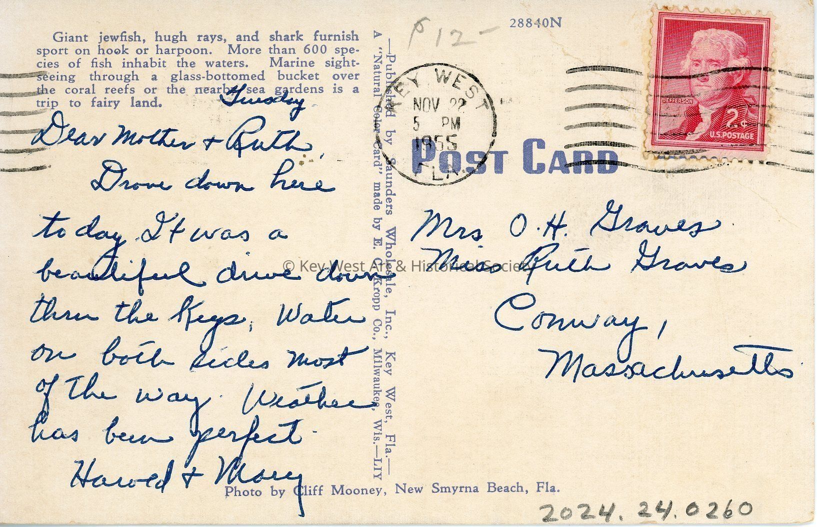 Tuesday- Dear Mother & Ruth, Drove down here today. It was a beautiful drive down thru the Keys. Water on both sides most of the way. Weather has been perfect. Harold & Mary.Dimensions