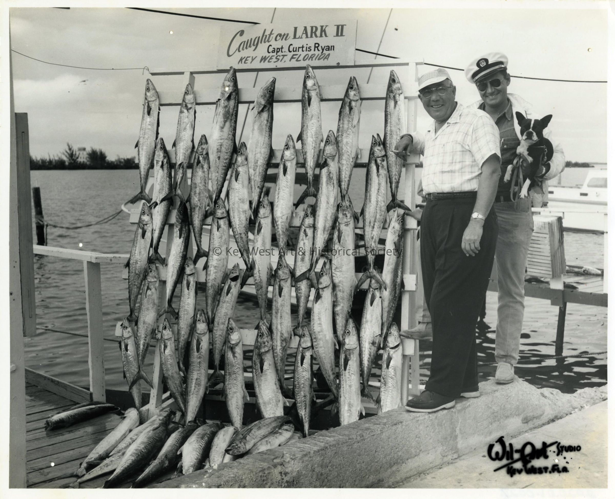 Black and white photograph of a catch made onboard the charter boat Lark II with Captain Curtis Ryan.