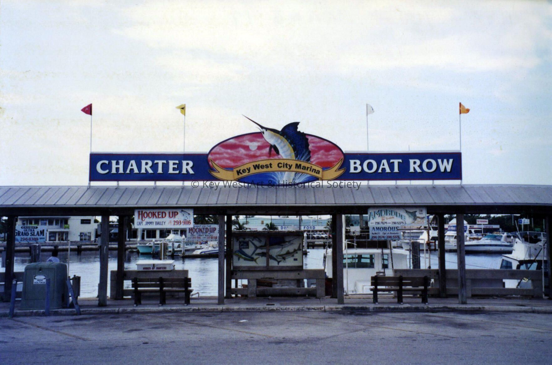Color photograph taken by historian James M. Goode of the Charter Boat Row sign at Garrison Bight Marina during a trip to Key West in August 2001. Printed from Roll 15.