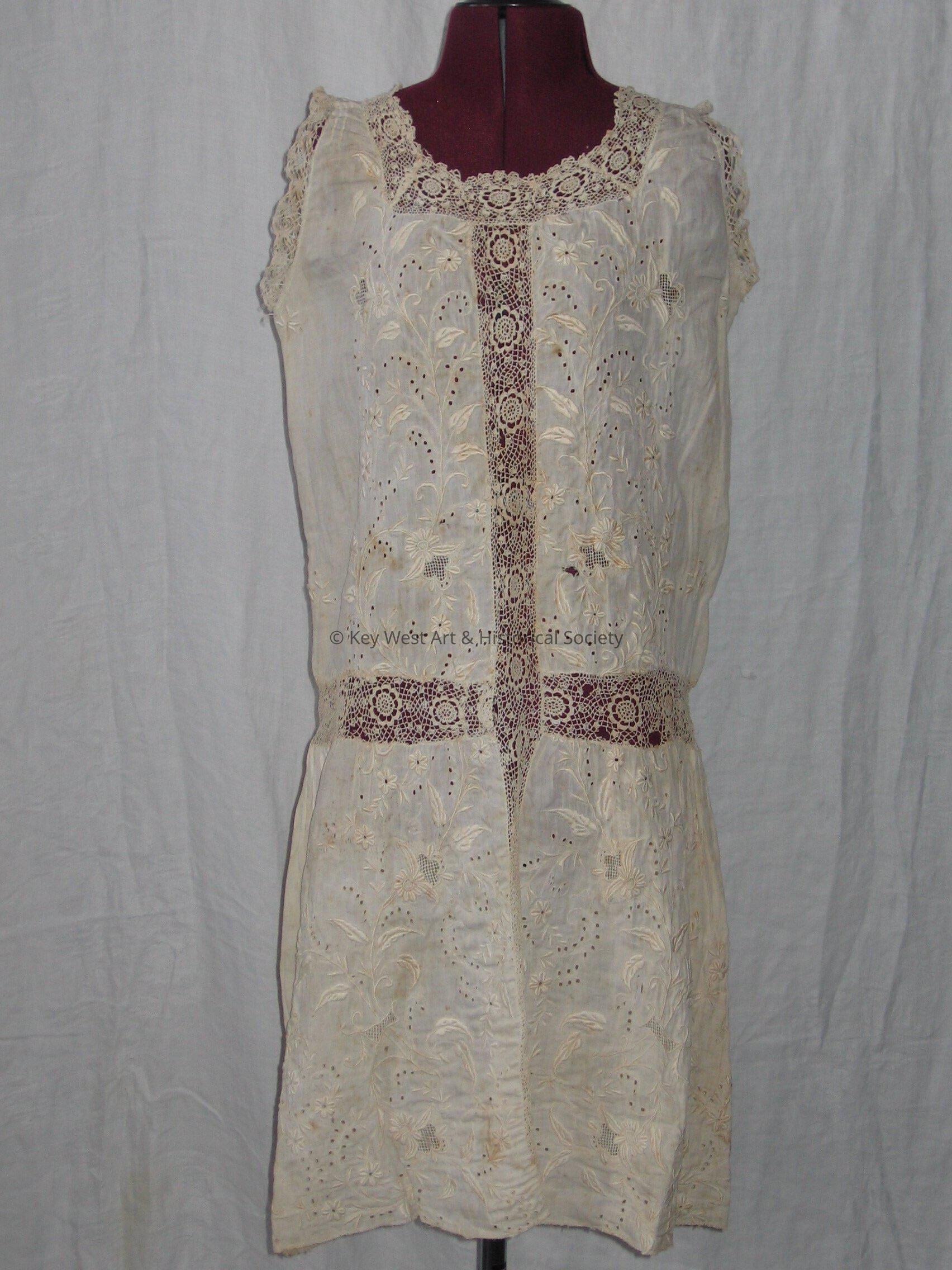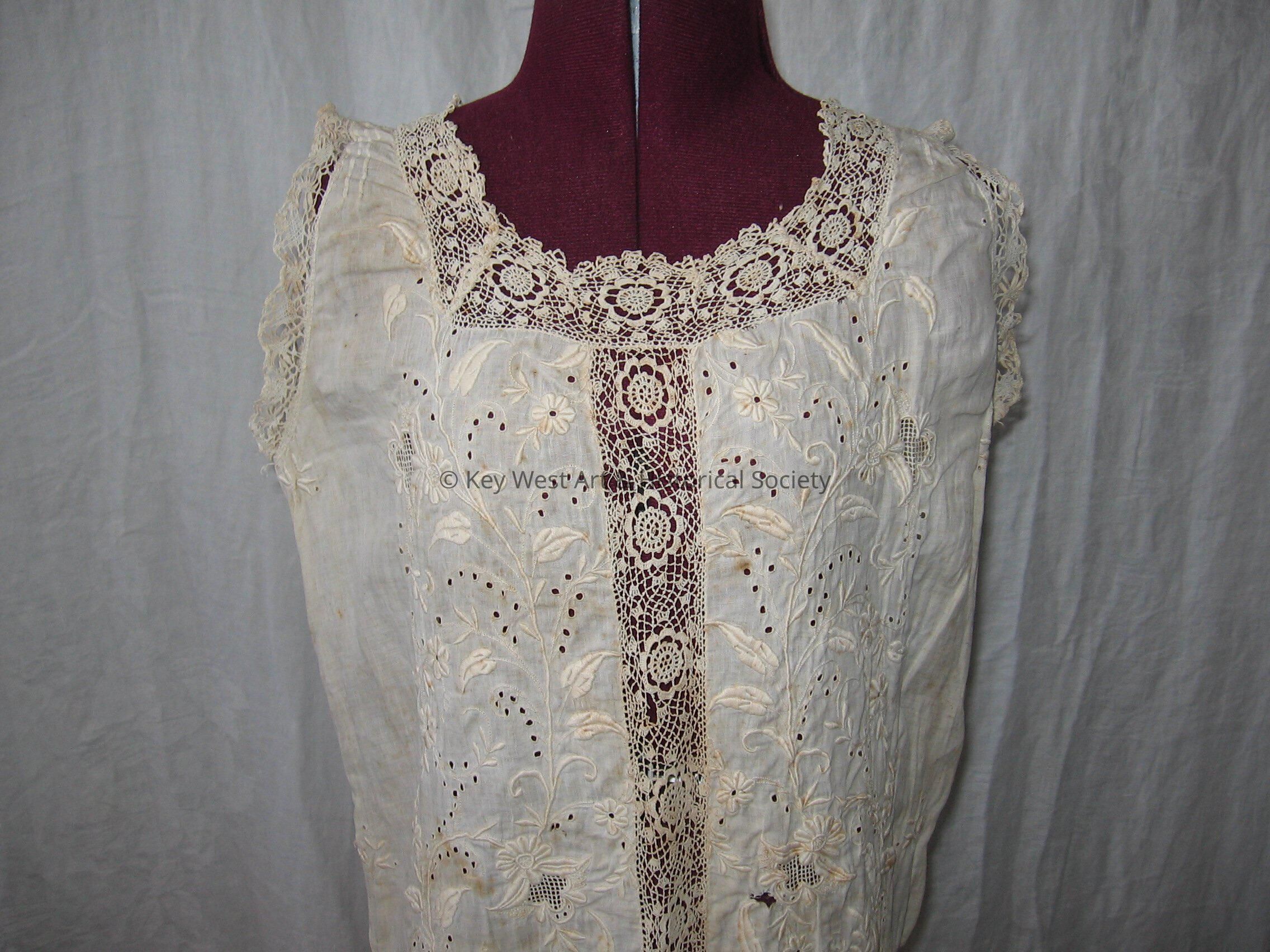 White chemise with a rounded neck. Neck and arm holes have scalloped edges. The fabric has a floral pattern.