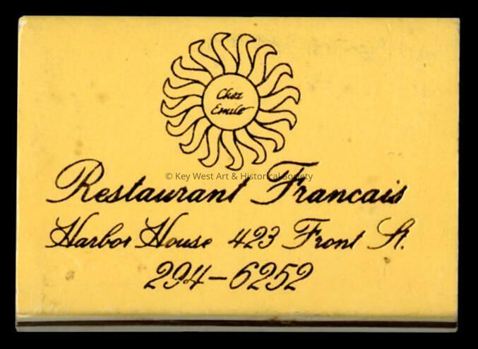 Paper matchbox from Chez Emile, French restaurant, formerly in the Harbor House, 423 Front Street. The opposite side is the logo for La Creperie at 124 Duval Street. No matches.Collection