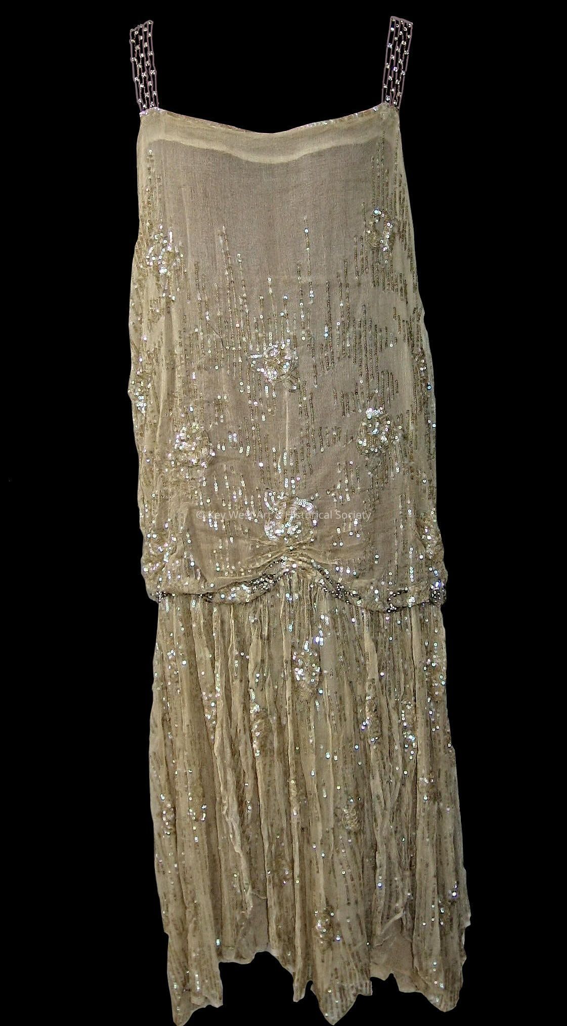 Hand-sewn chiffon flapper dress. The dress has sequins along the body and also has rhinestone straps.Collection