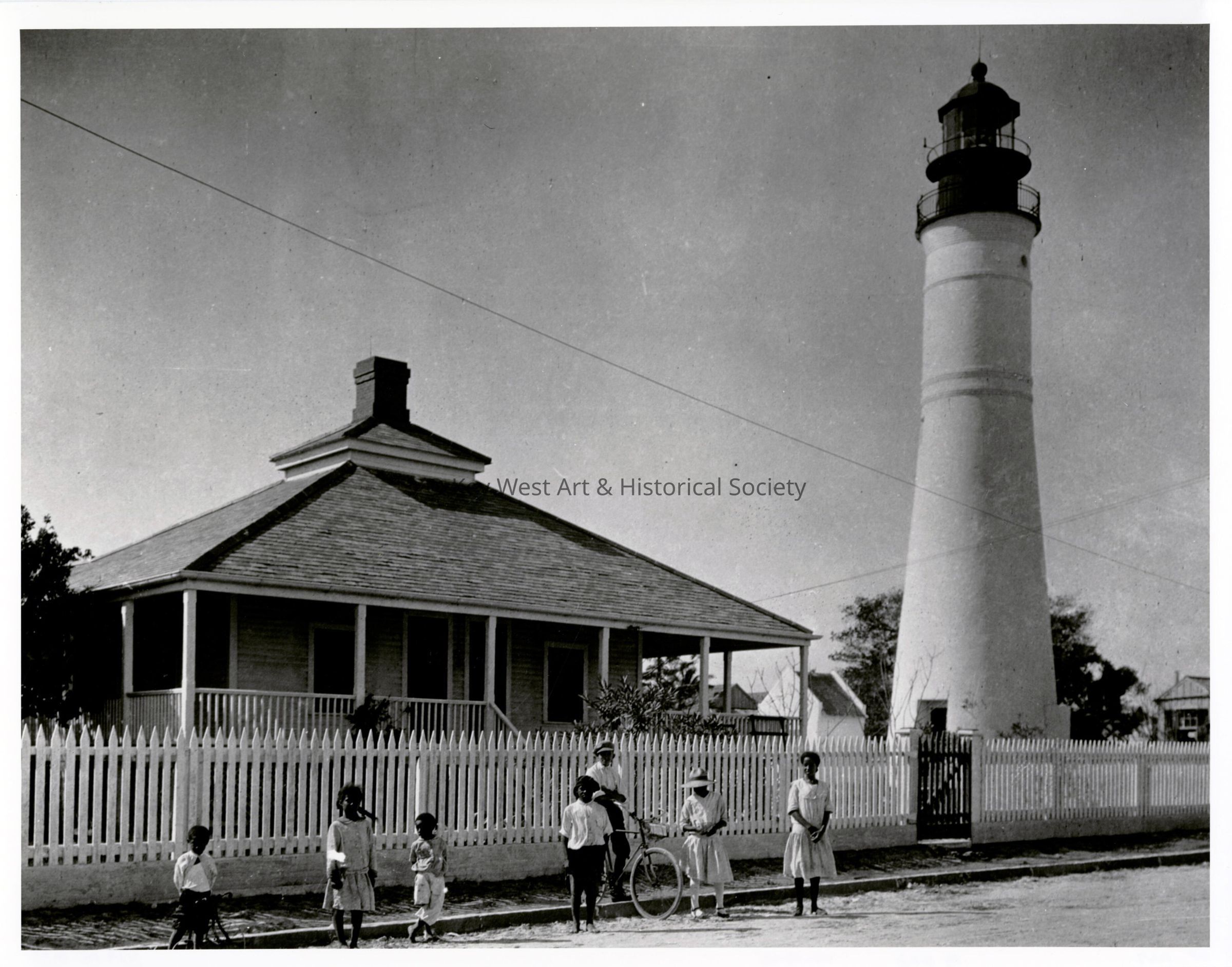 Black and white photograph of local children standing outside of the Key West Lighthouse and Keeper's Quarters property.