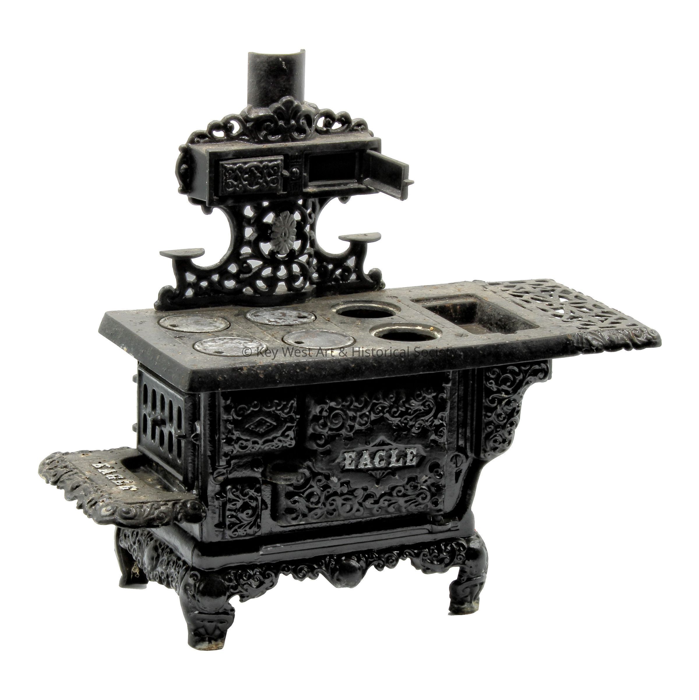 Cast iron children's 'Eagle' toy stove manufactured by the Hubley Manufacturing Company. Black with silver lettering.Collection