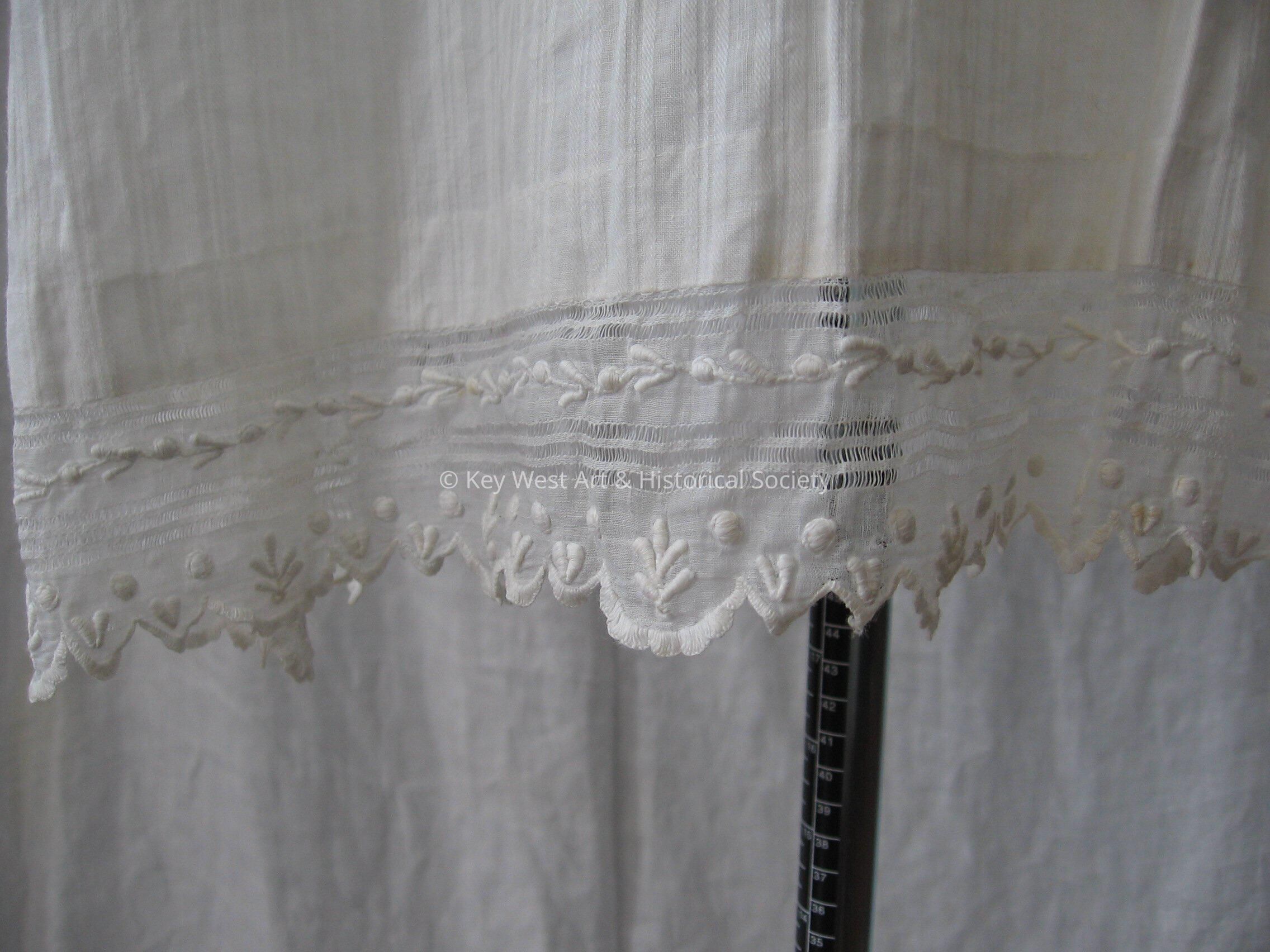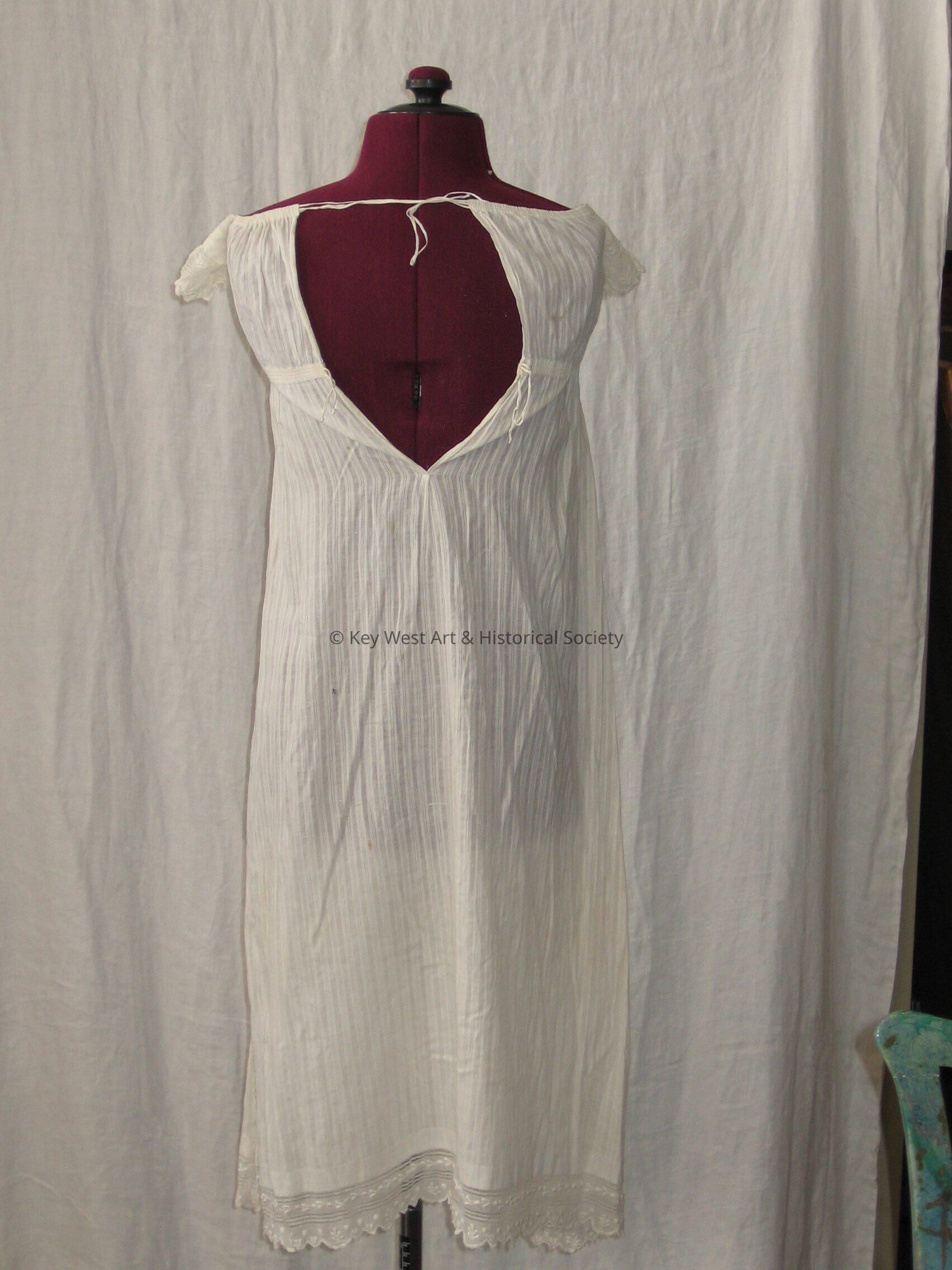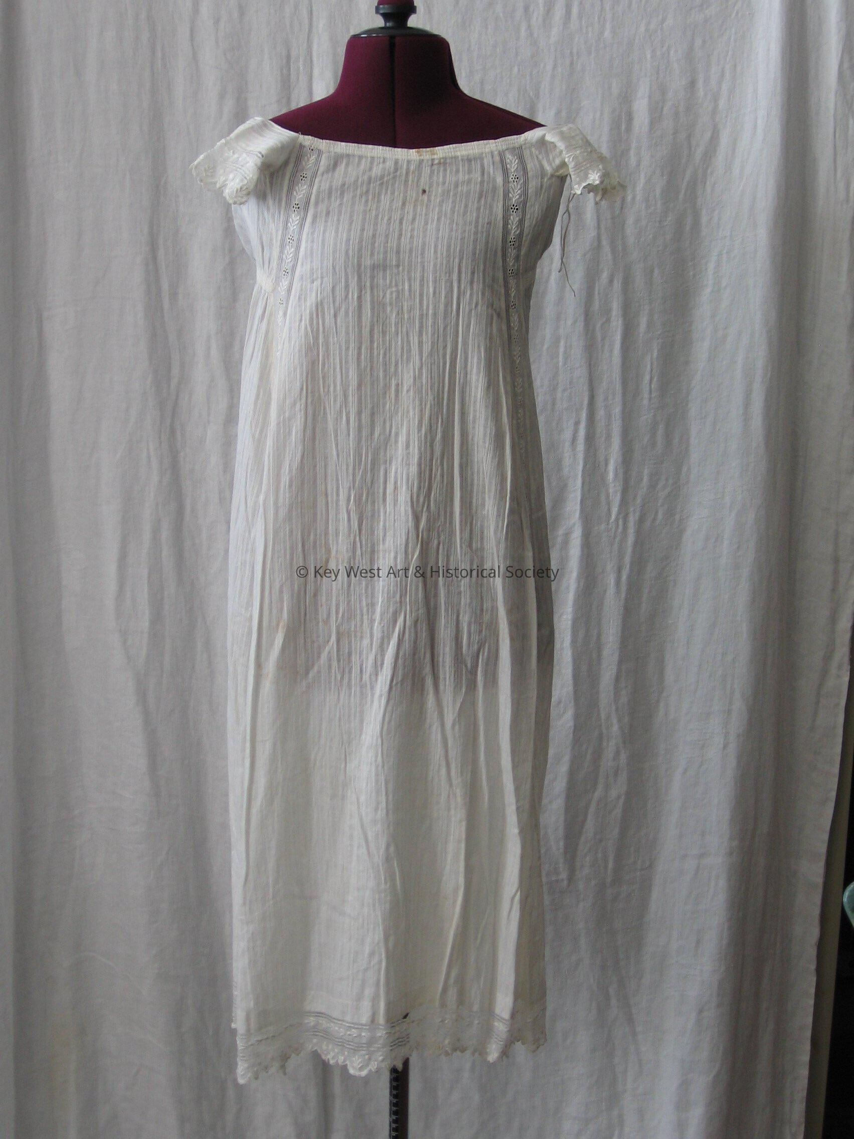 White cotton chemise with a vertical stripe pattern. Lace insets on the bodice of gown and on hem. Sleeves have lace and embroidery work. Tie closure in back.Collection