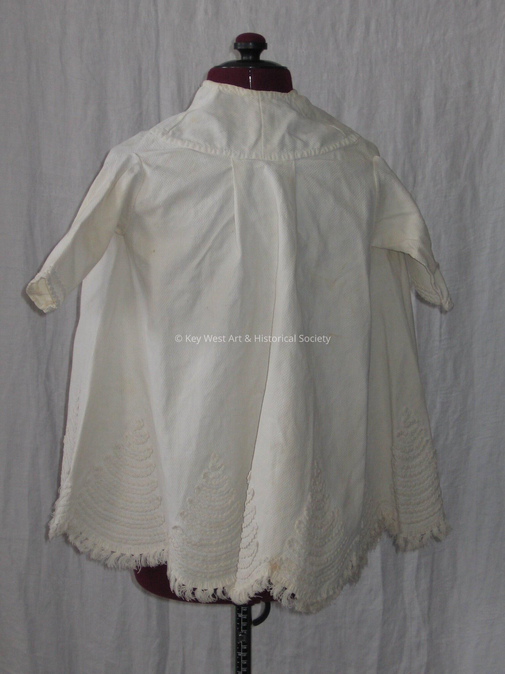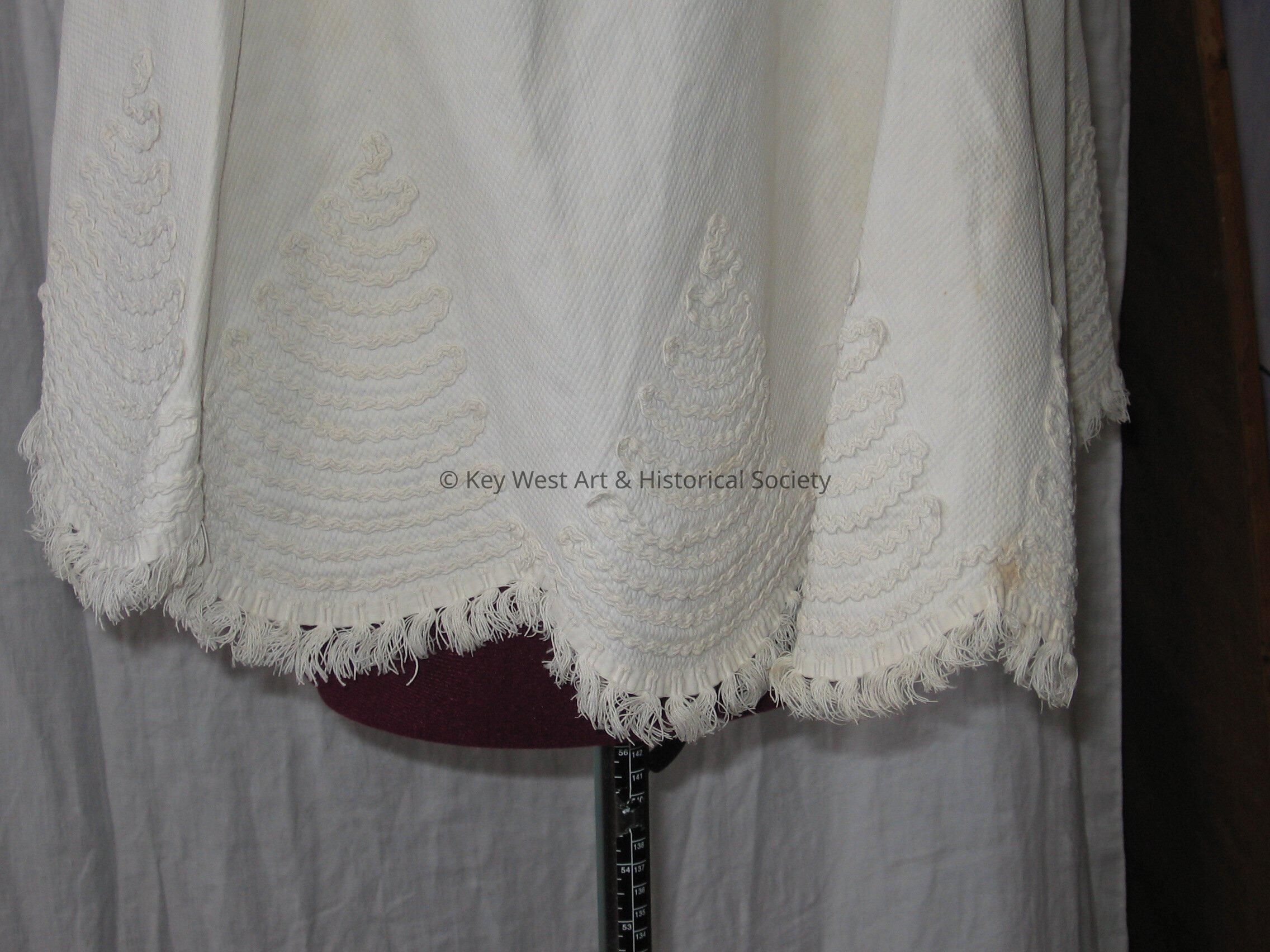 White coat with a quilted pattern. Fringe trim. Embroidered design on bodice.