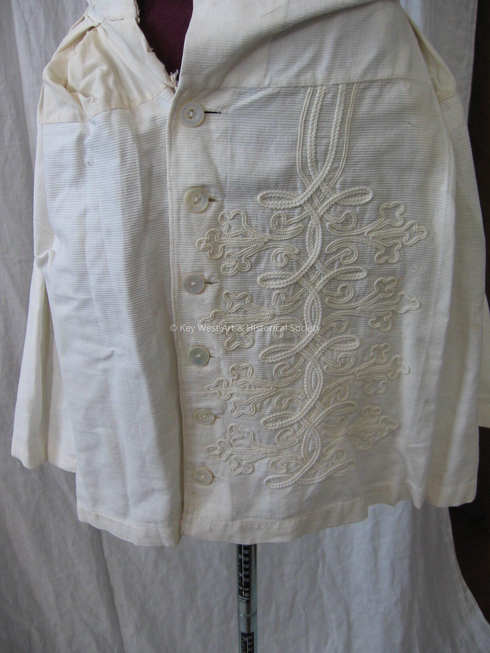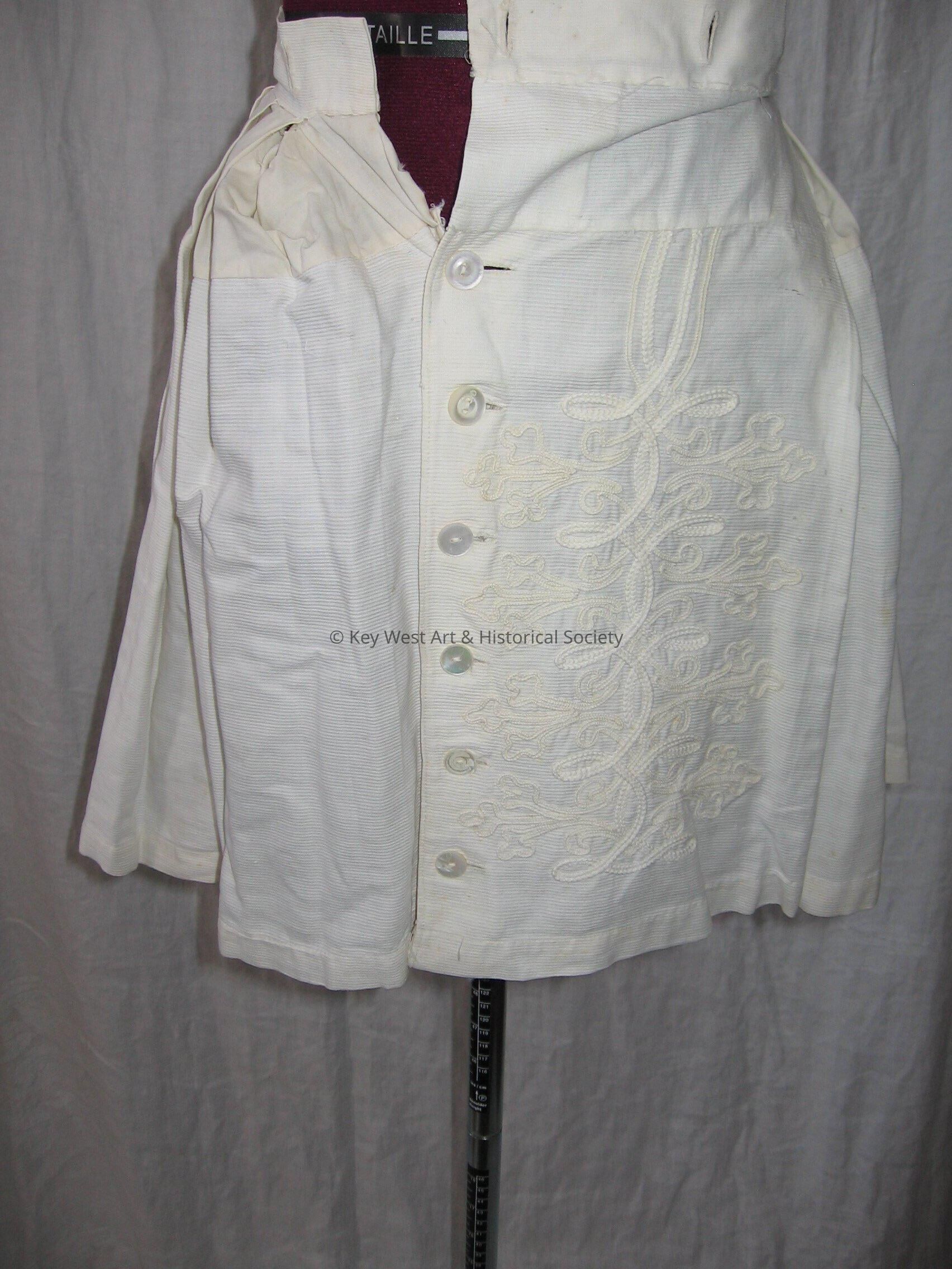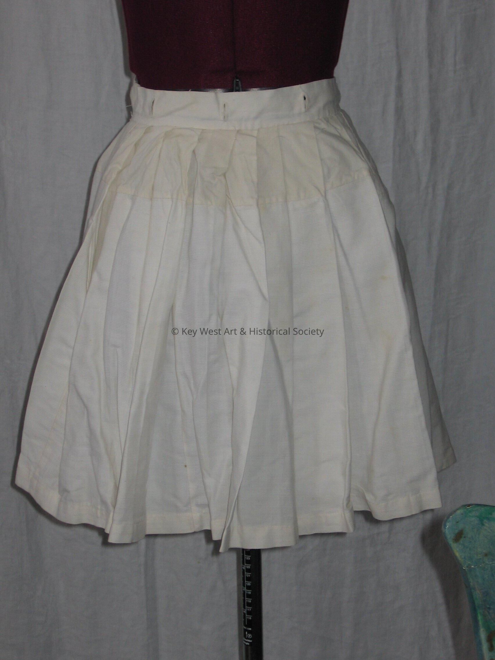 White pleated cotton skirt with button closure and an embroidered design by the button closure.