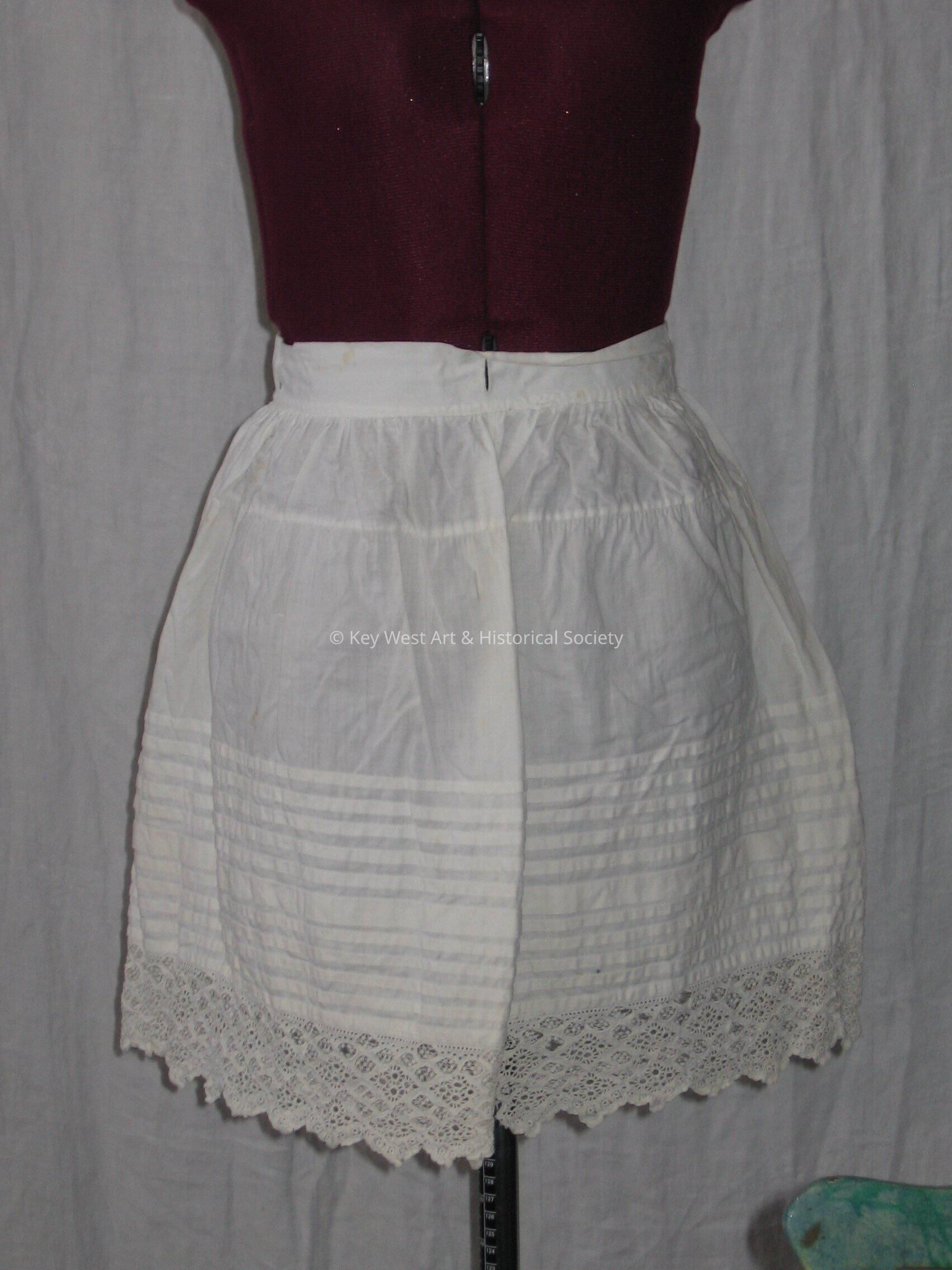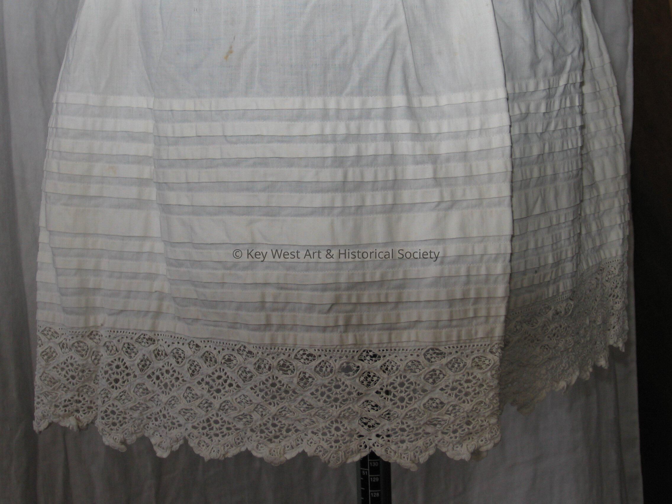 White cotton slip for a child. Button closure. Embroidered lace on trim and horizontal pleating on the lower half.