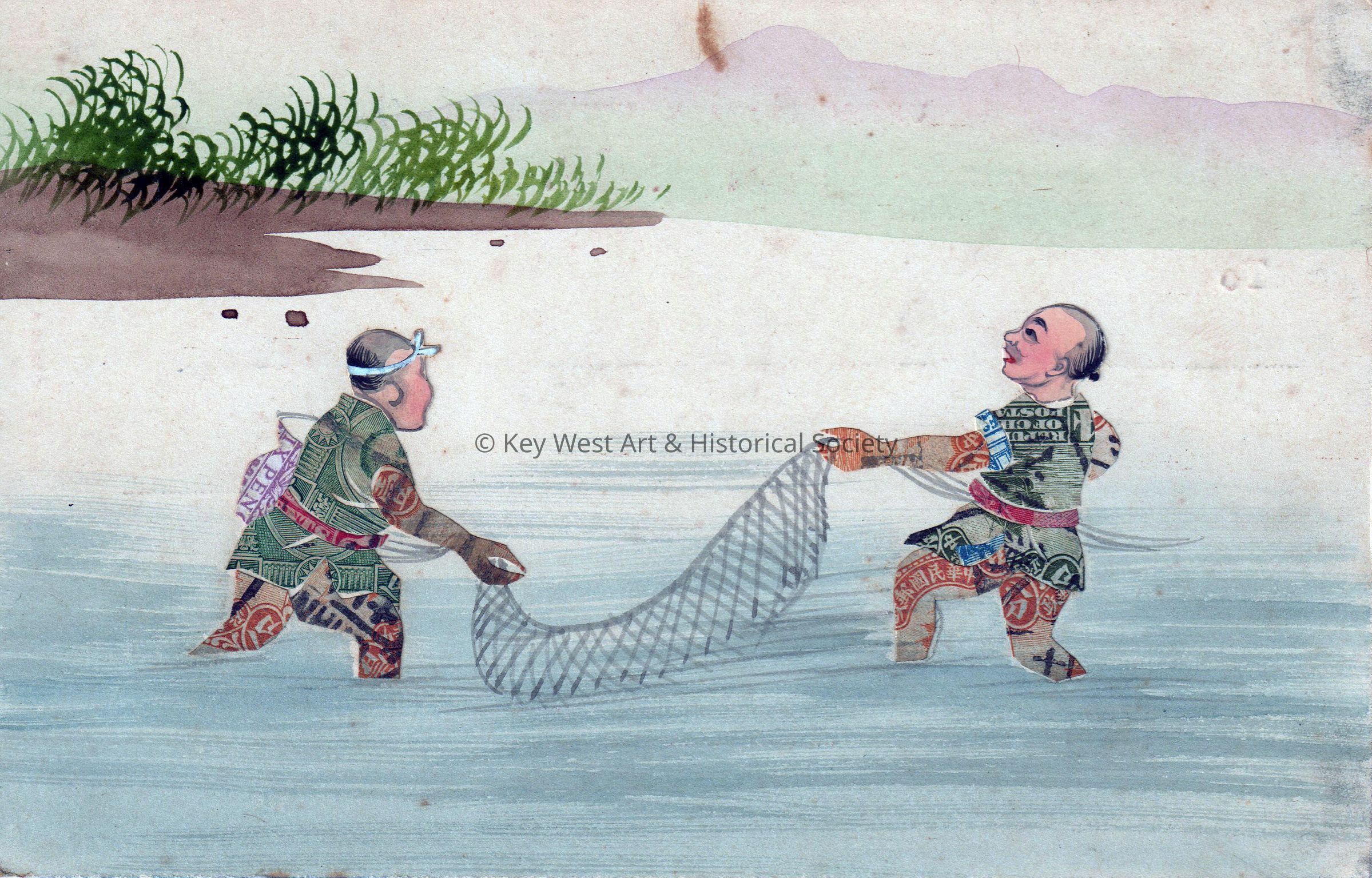 Postcard depicting a drawing of two Chinese Fishermen. Their clothing appears to be made from postage stamps or currency.Collection