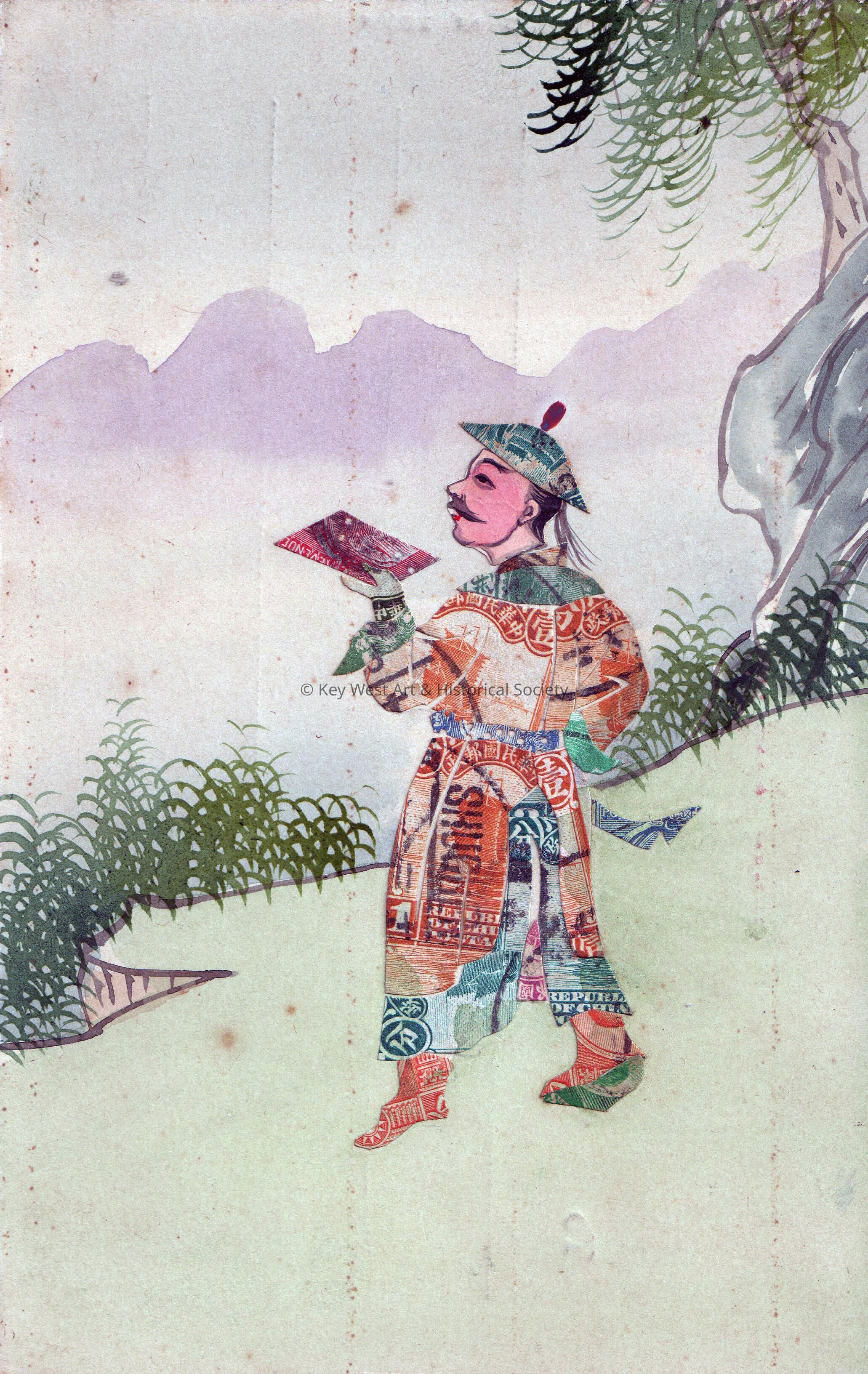 Postcard depicting a drawing of a Chinese Man holding a plate. His clothing appears to be made from postage stamps or currency.