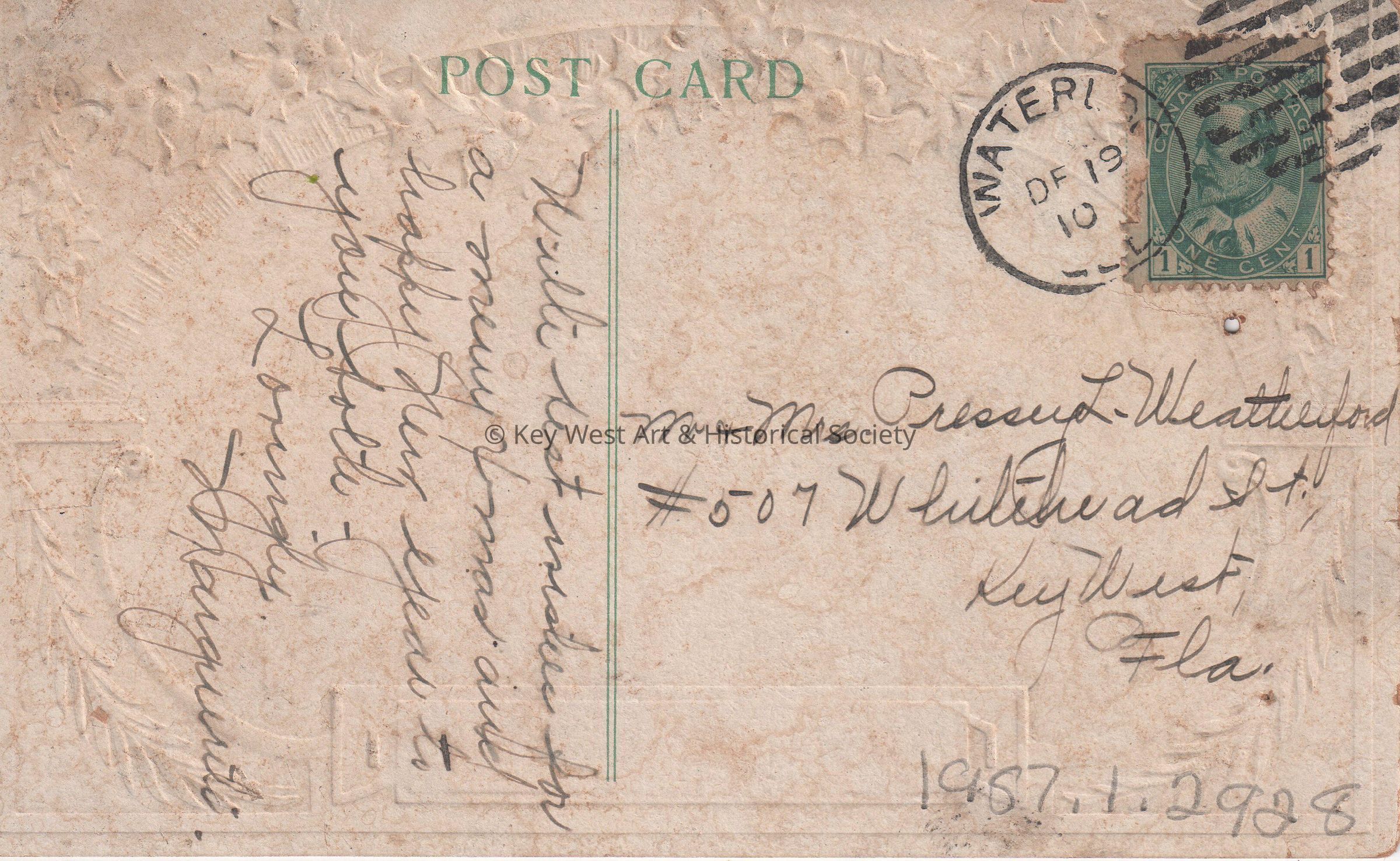 Postcard depicting houses in the snow beneath a garland of holly. The caption reads, ‘Bonne Annee’. The message on the verso reads, ‘With best wishes for a Merry Christmas and Happy New Year to you both. Lovingly, Marguerite’. The card is addressed to Mr. & Mrs. Pressey L. Weatherford, #507 Whitehead Street, Key West, Florida, and is postmarked Waterloo, December 19, 1910.Collection