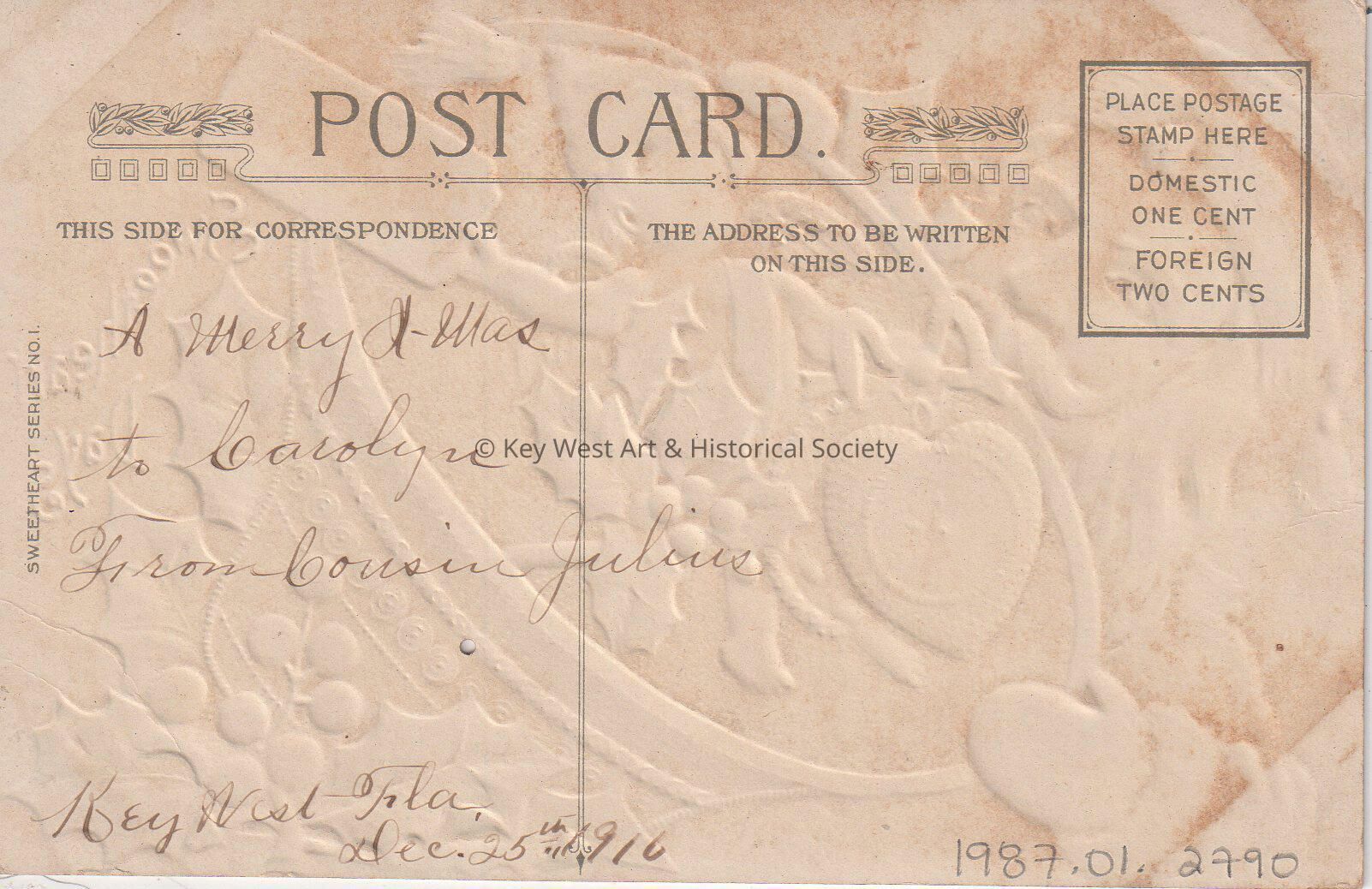 A Merry X-mas to Carolyn. From Cousin Julius. Key West, Fla. December 25, 1916.Language