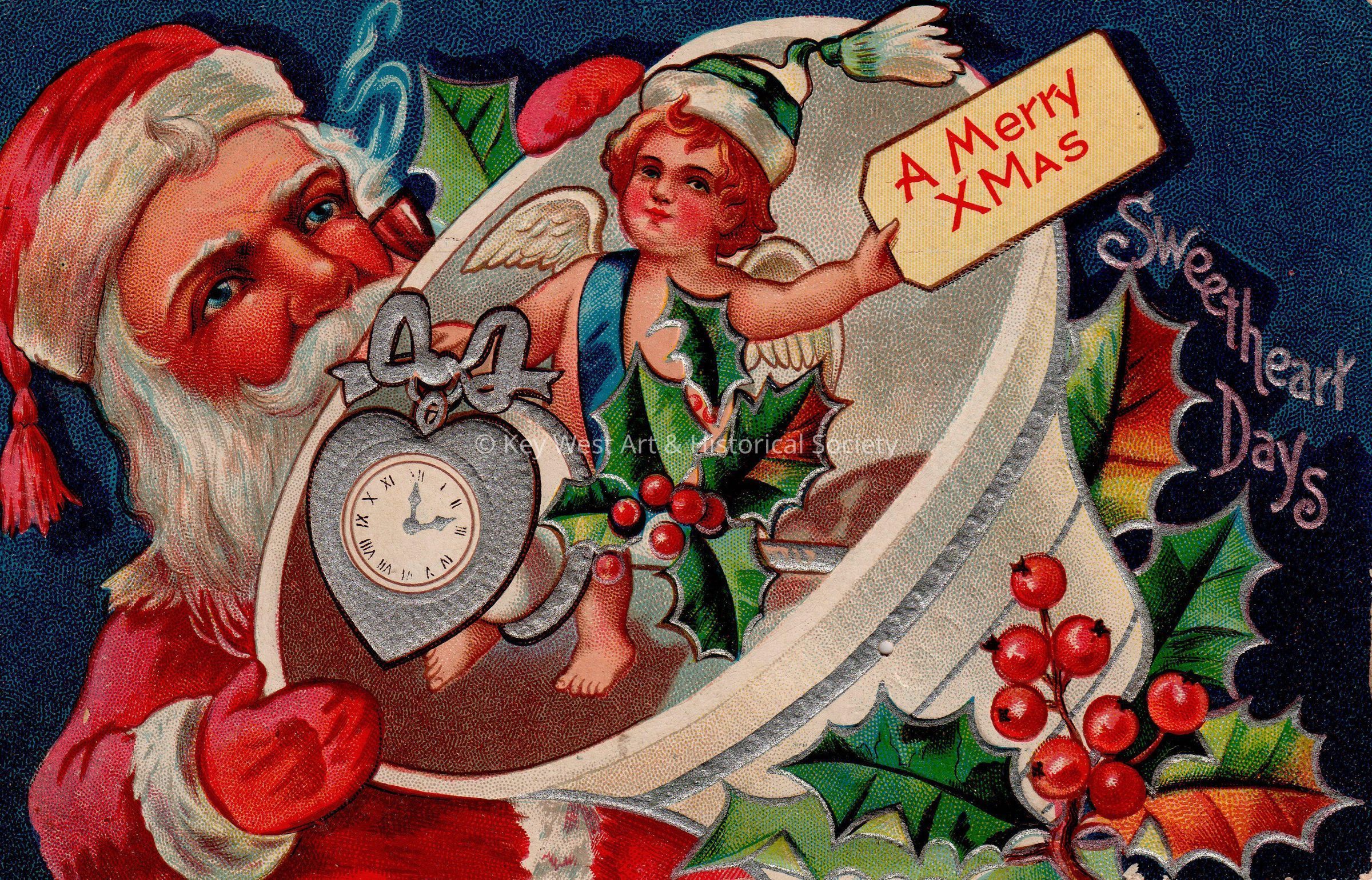 Postcard depicting Santa Claus with a cupid, heart-shaped clock, and holly sprigs. The caption reads, ‘A Merry Christmas - Sweetheart Days’.Collection