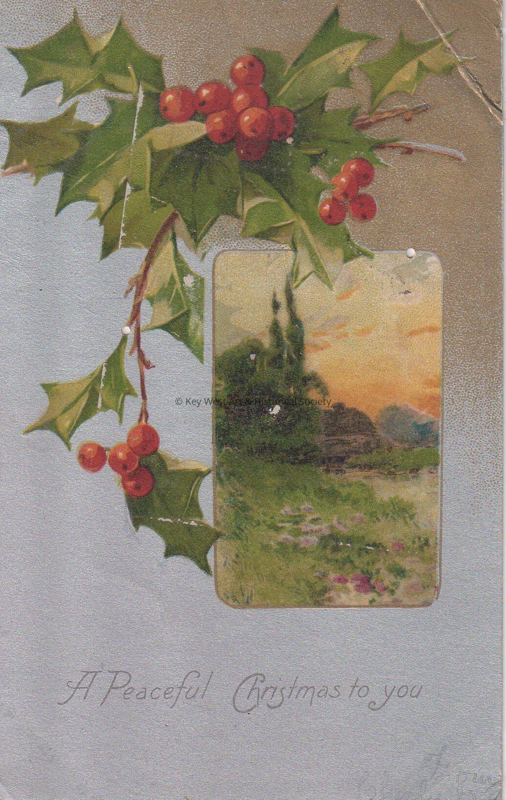 Postcard depicting holly sprigs near a painting of a pastoral scene. The caption reads, ‘A Peaceful Christmas to you. From Charles’. The card is addressed to J.W. Hattrick, 2012 Latona, Street, Southwest Station, Philadelphia, Pennsylvania, and is postmarked Burlington, New Jersey, December 24.Collection