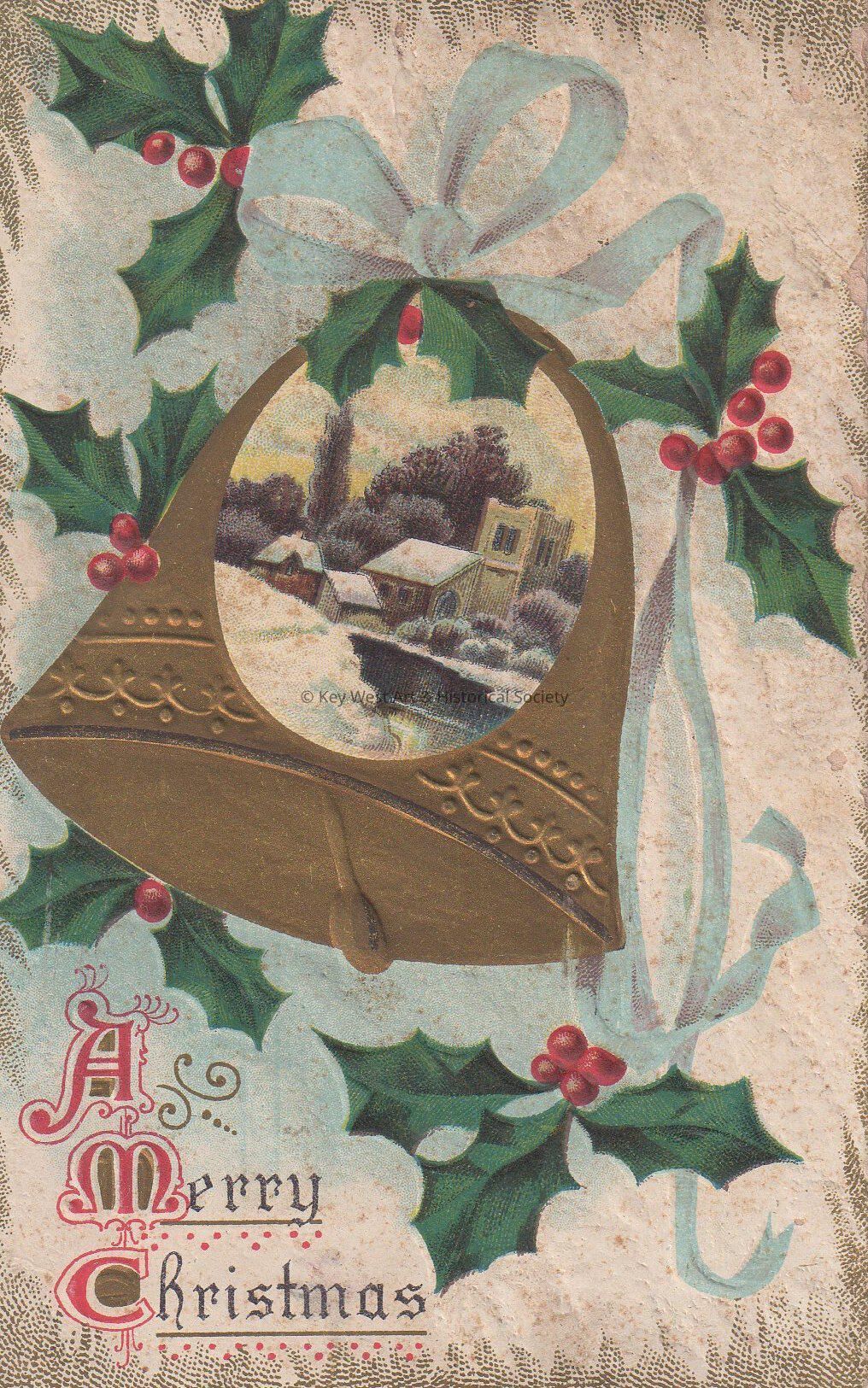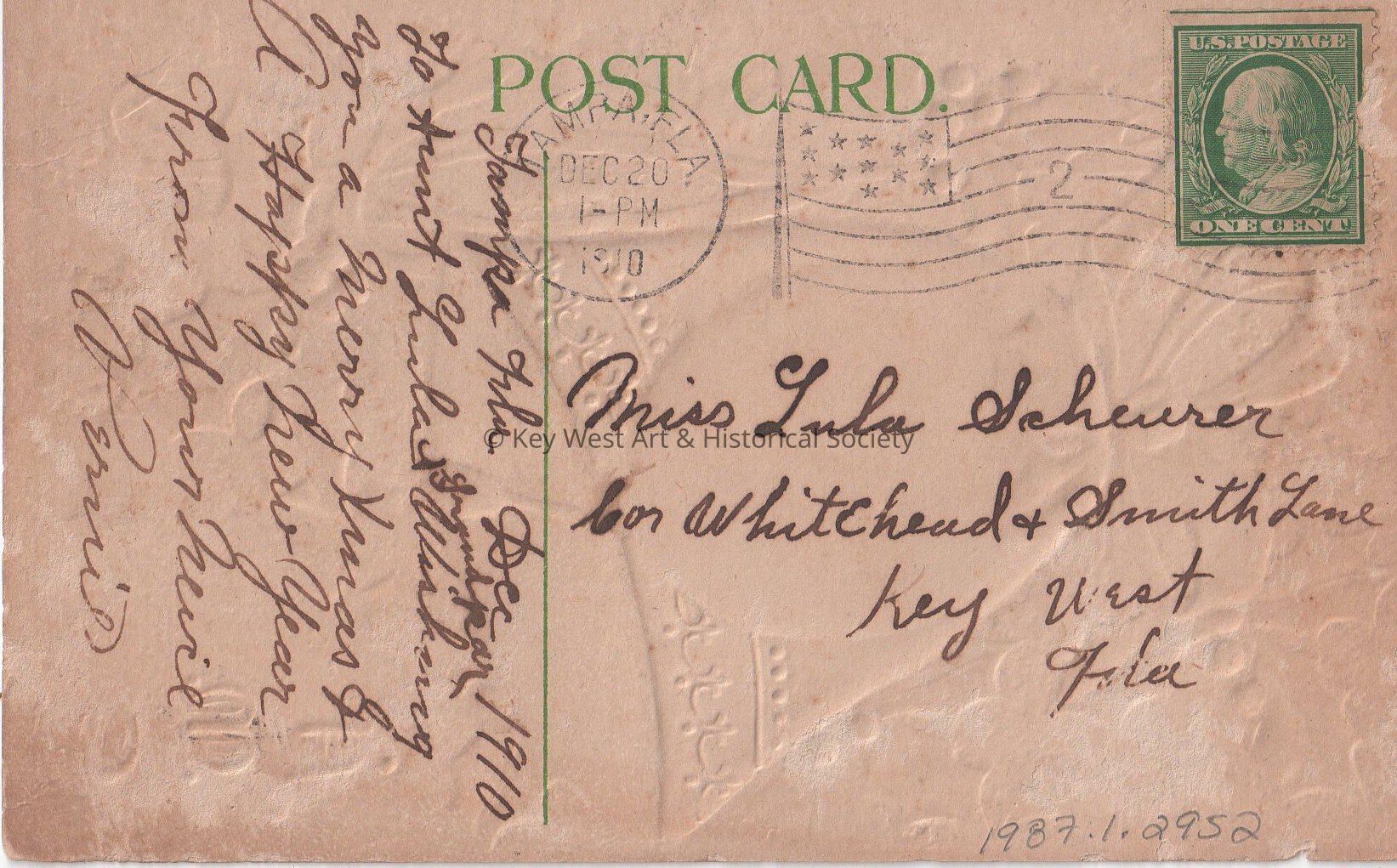 Postcard depicting holly sprigs near a bell framing a painting of a snow-covered building. The caption reads, ‘A Merry Christmas’. The message on the verso reads, ‘Tampa, Florida, December, 1910, To Aunt Lula & Grandpa, Wishing you a Merry Christmas & A Happy New Year. From your niece, Vernie’. The card is addressed to Miss Lula Scheurer, Corner of Whitehead & Smith Lane, Key West, Florida, and is postmarked Tampa, December 20, 1910.Collection