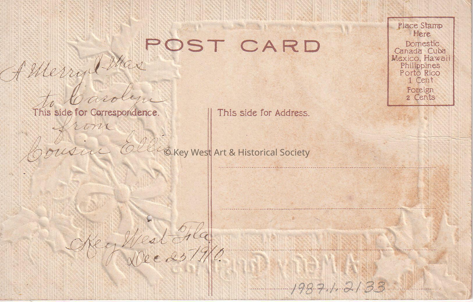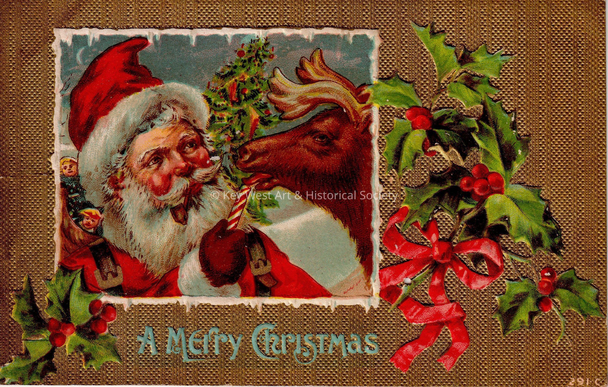 Postcard depicting Santa Claus feeding a candy cane to a reindeer. The caption reads, ‘A Merry Christmas’. The message on the verso reads, 'A Merry Christmas to Carolyn from Cousin Ellis, Key West, Florida, December 25, 1910'.Collection