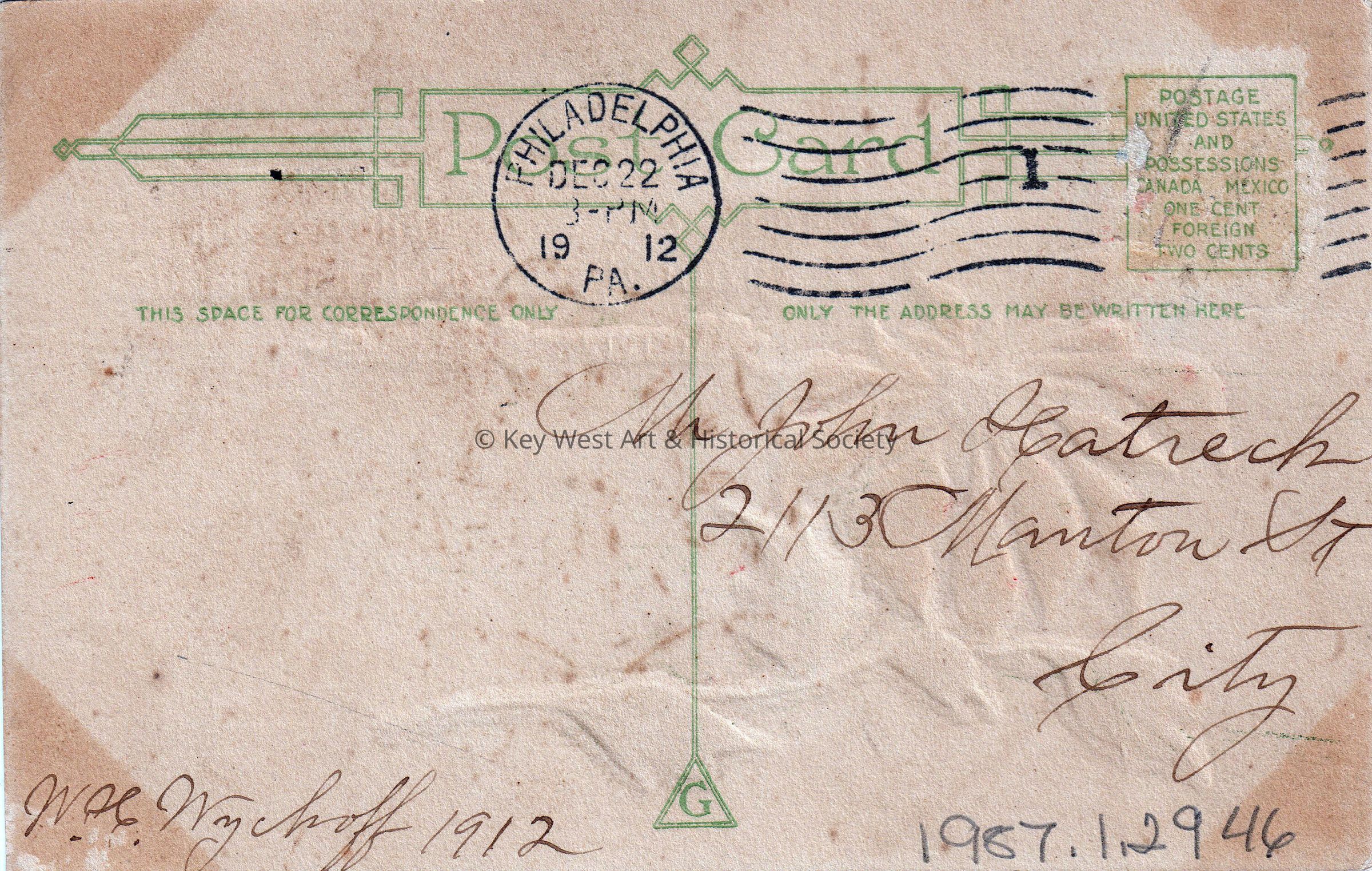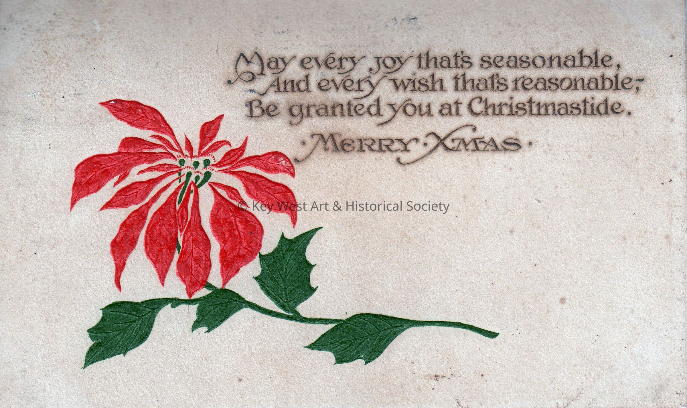 Postcard depicting a poinsettia. The caption reads, ‘May every joy that’s seasonable, And every wish that’s reasonable, Be granted you at Christmastide. Merry Christmas’. The card is signed W. G. Wychoff, 1912. The card is addressed to Mr. John Hattrick, 2113 Manton Street, City, and postmarked Philadelphia, December 22, 1912.Collection