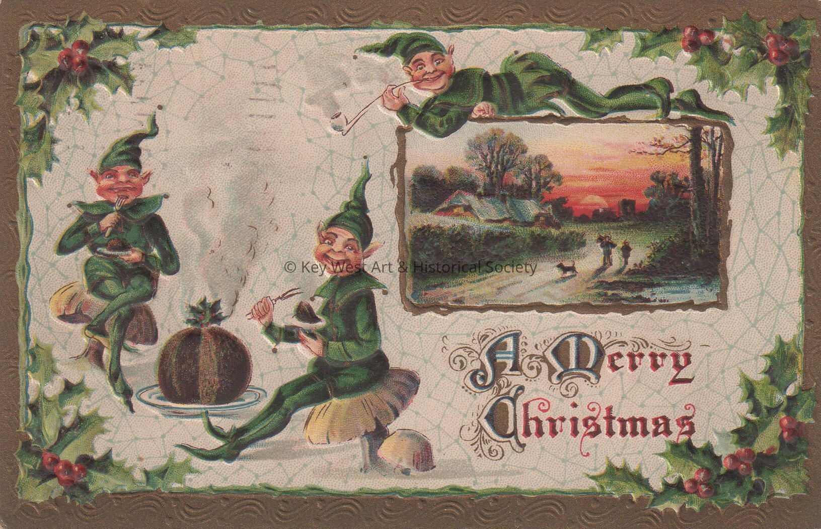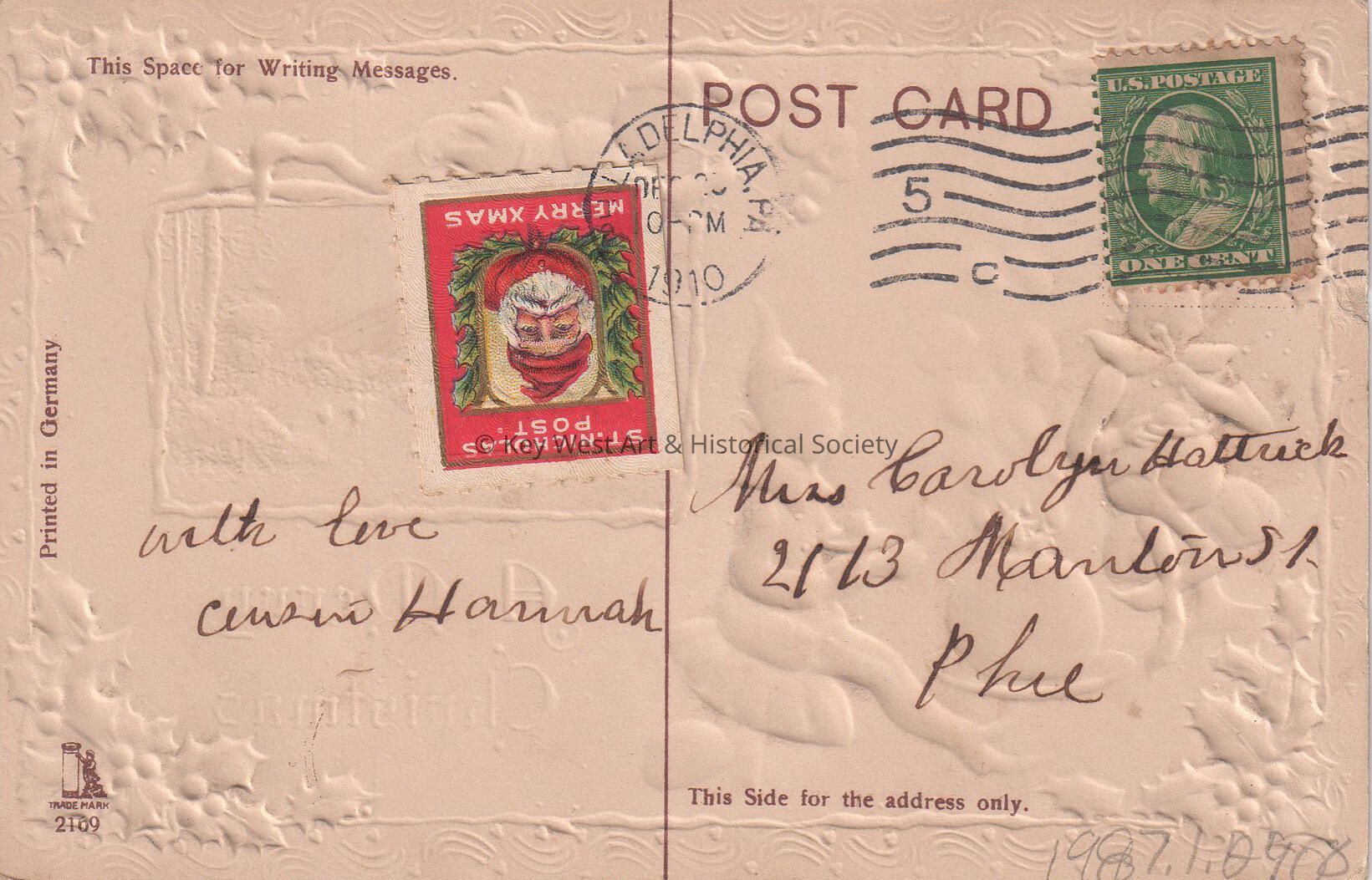 Postcard depicting elves sitting on mushrooms beneath holly sprigs and eating a Christmas cake. The caption reads, ‘A Merry Christmas’. The message on the verso reads, 'With love, Cousin Hannah'. The card is addressed to Miss Carolyn Hattrick, 2113 Manton Street, Philadelphia, and is postmarked Philadelphia, December 23, 1910.Collection