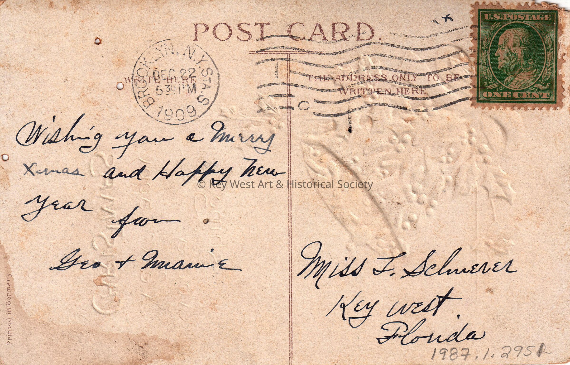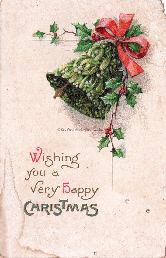 Postcard depicting a bell made of mistletoe adorned with a bow and holly leaves. The caption reads, ‘Wishing you a very happy Christmas’. The message on the verso reads, ‘Wishing you a Merry Christmas and Happy New Year from George and Mamie.’ The card is addressed to Miss L. Scheurer, Key West, Florida, and is postmarked Brooklyn, New York, December 22, 1909.Collection