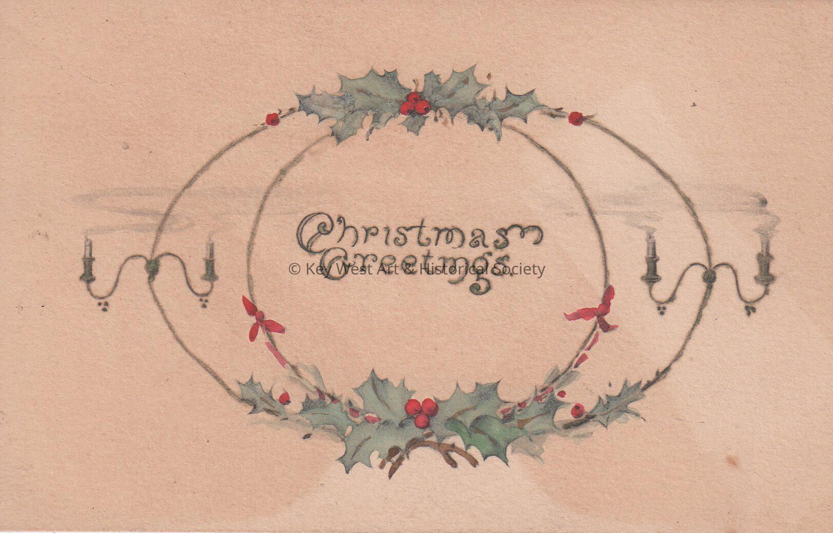 Postcard depicting candles and holly sprigs. The caption reads, ‘Christmas Greetings’.Collection