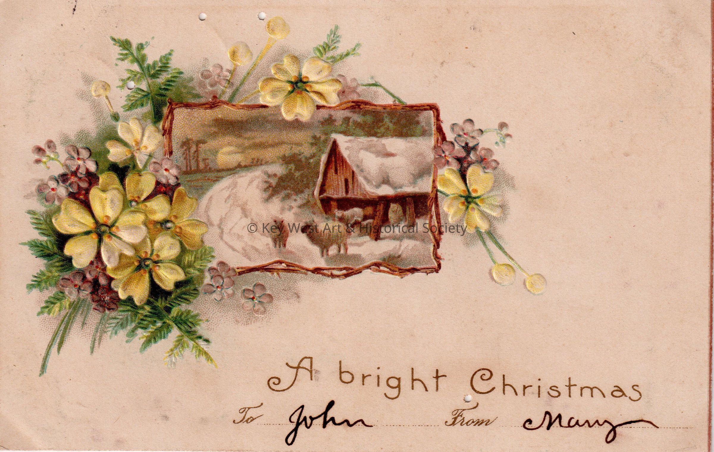 Postcard depicting flowers near a painting of sheep in the snow. The caption reads, ‘A Bright Christmas To John From Mary’. The card is addressed to Mr. John W. Hattrick, 2012 Latona Street, Philadelphia, Pennsylvania, USA, and is postmarked Nassau, Bahamas, December.Collection