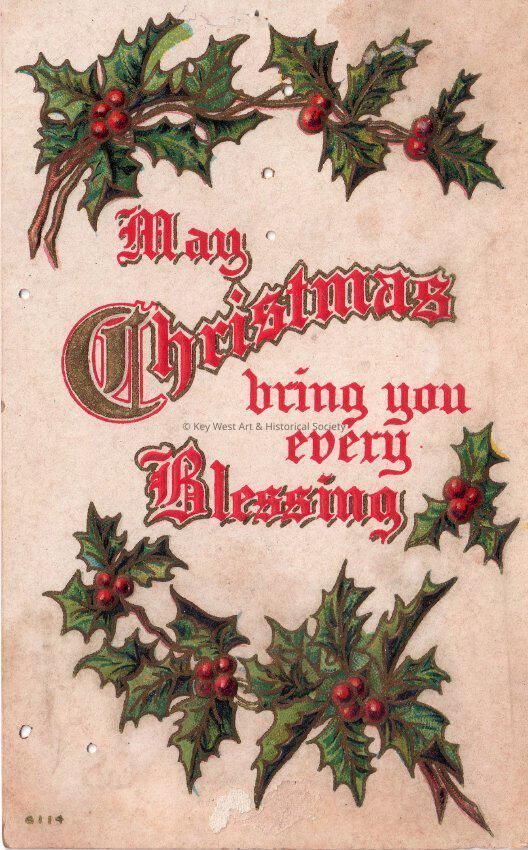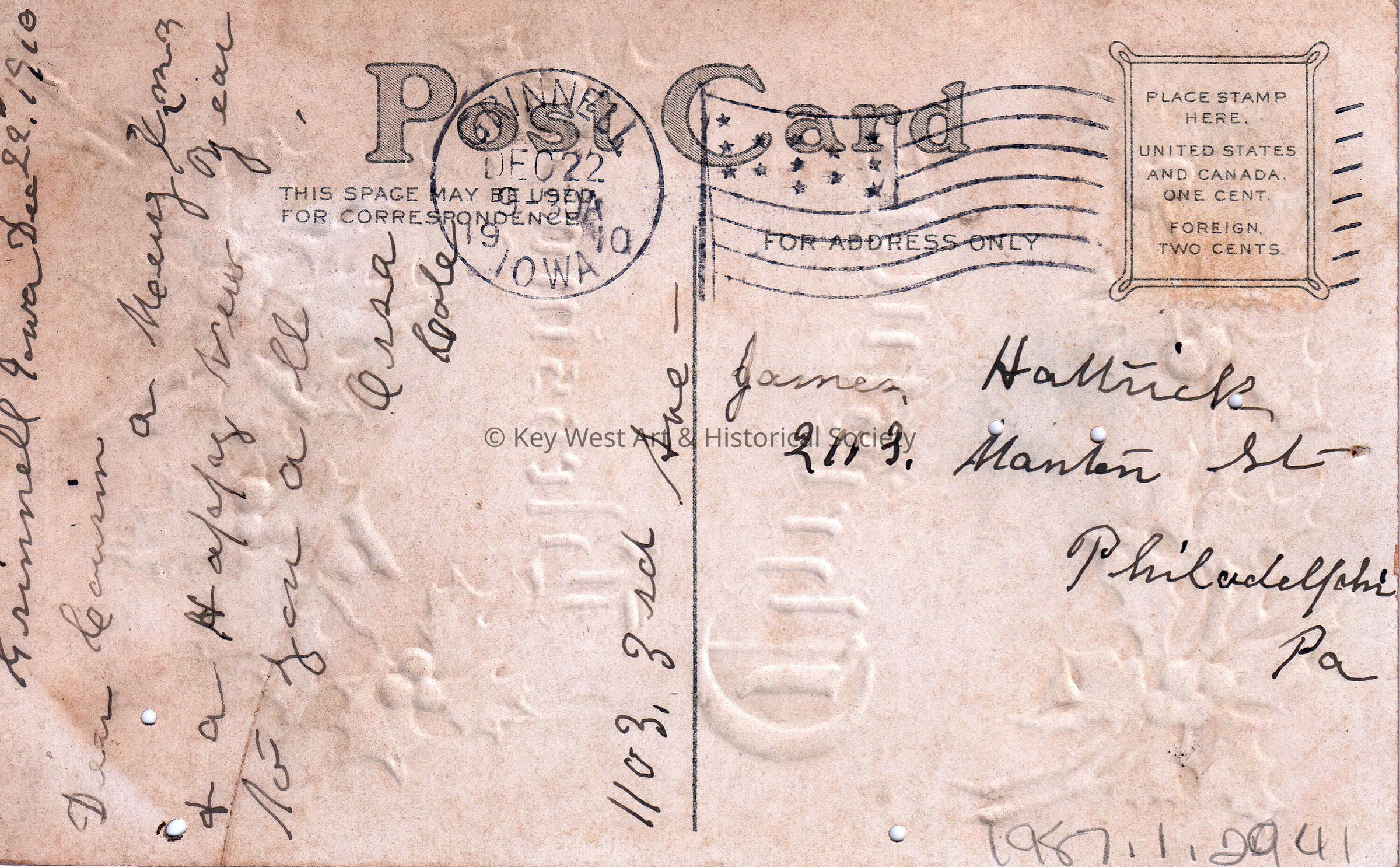 Postcard of holly leaves. The caption reads, ‘May Christmas bring you every Blessing’. The message on the verso reads, ‘Grinnell, Iowa, December 22, 1910, Dear Cousin, A Merry Christmas & a Happy New Year to you all. Orsa Cole, 1103 3rd Ave.’ The card is addressed to James Hattrick, 2113 Manton Street, Philadelphia, Pennsylvania, and is postmarked Grinnell, Iowa, December 22, 1910.Collection