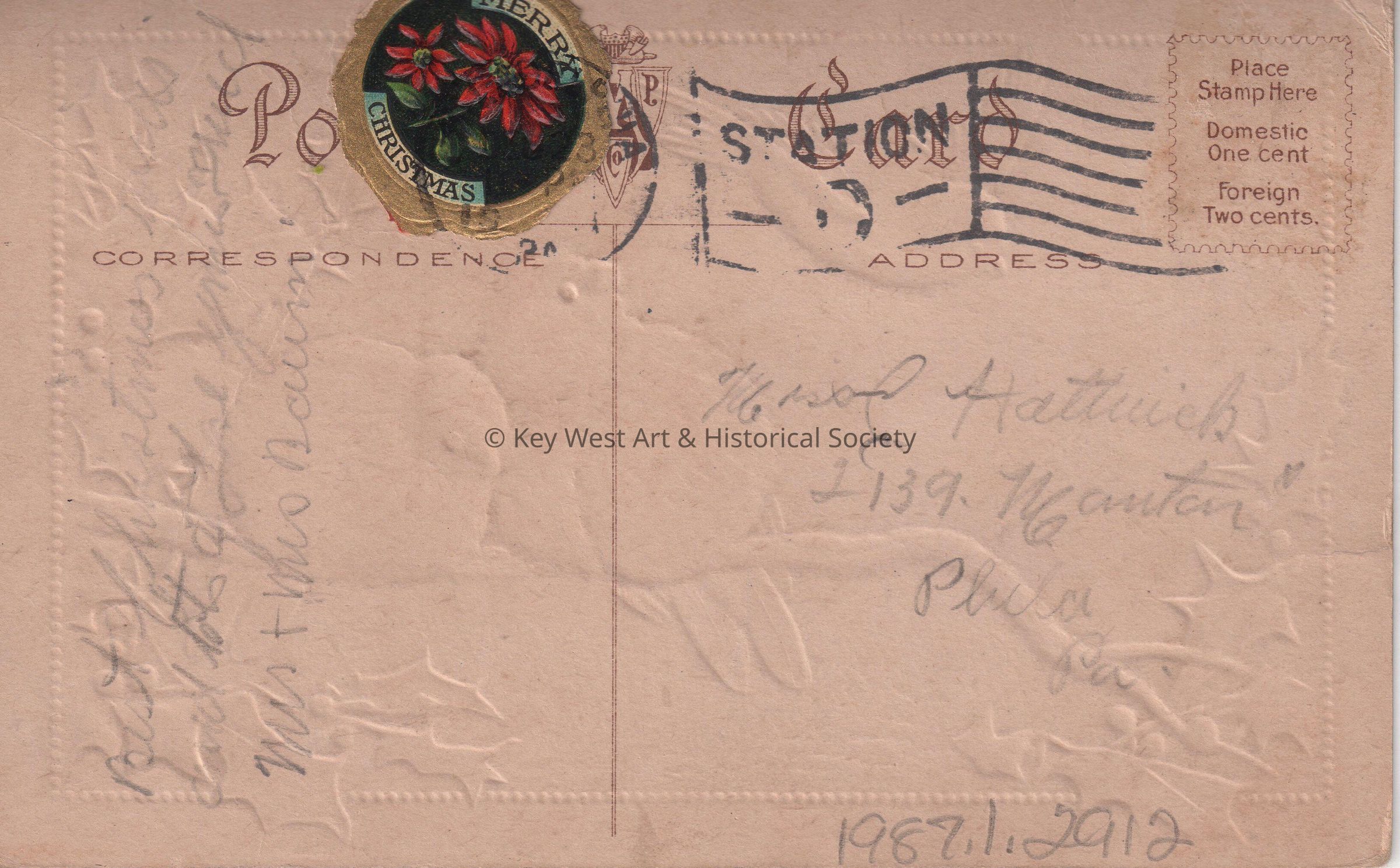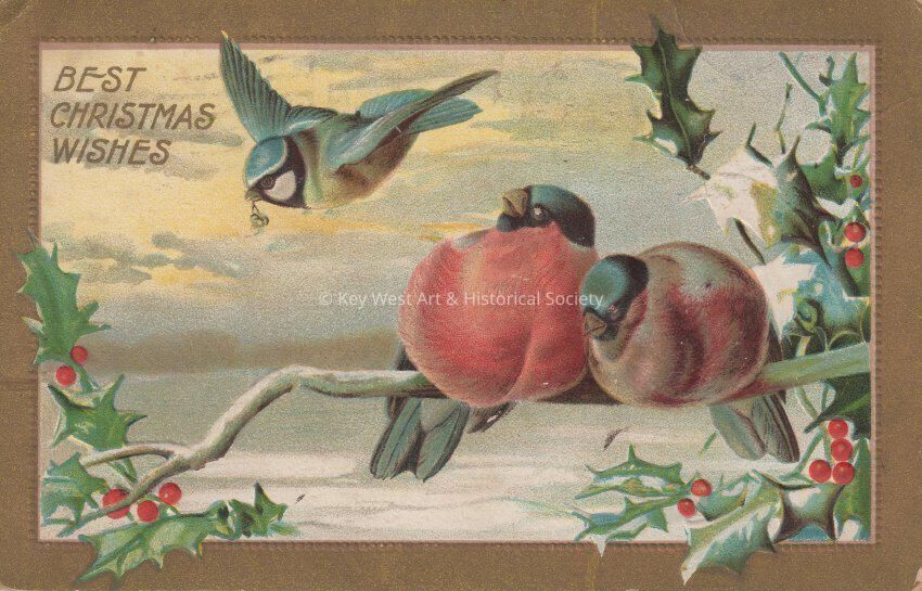Postcard depicting birds and holly sprigs. The caption reads, ‘Best Christmas Wishes’. The message on the verso reads, ‘Best Christmas and lots of love. Mr. and Mrs. Baum’. The card is addressed to Miss C. Hattrick, 2113 Manton Street, Philadelphia, Pennsylvania.Collection