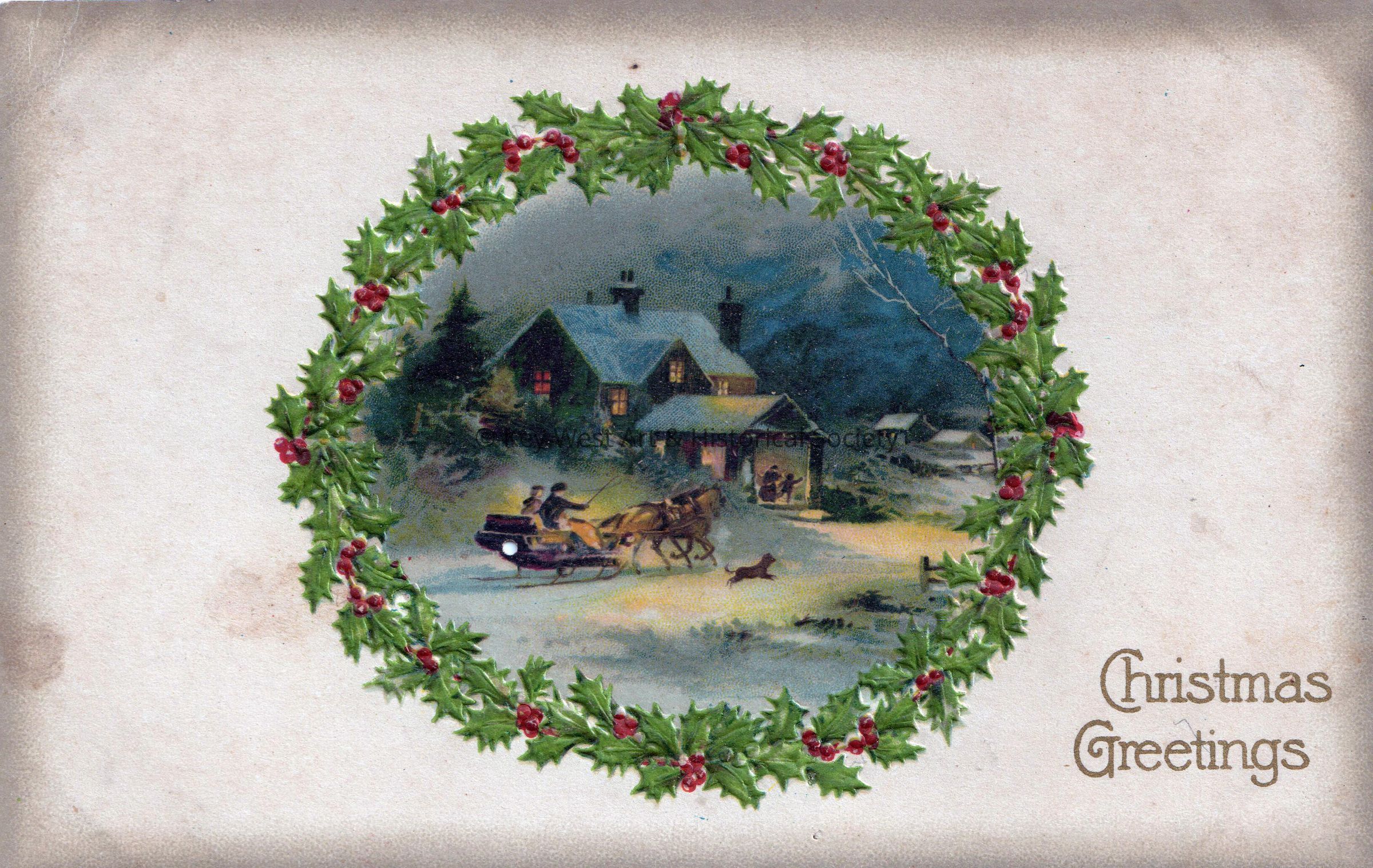 Postcard depicting holly sprigs surrounding a painting of a horse-drawn sleigh in the snow. The caption reads, ‘Christmas Greetings’.Collection