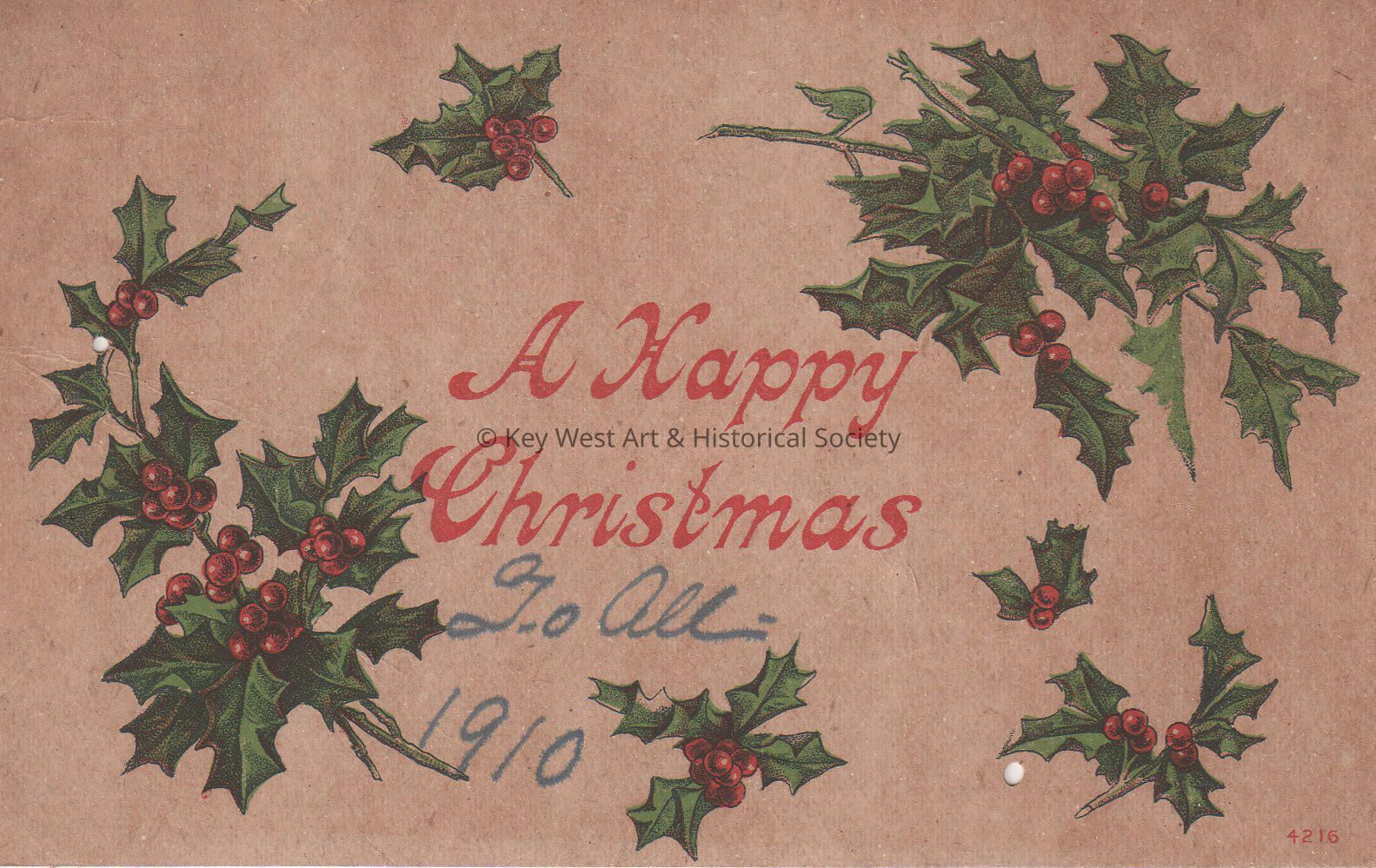 Postcard depicting holly sprigs. The caption reads, ‘A Happy Christmas To all. 1910’.Collection
