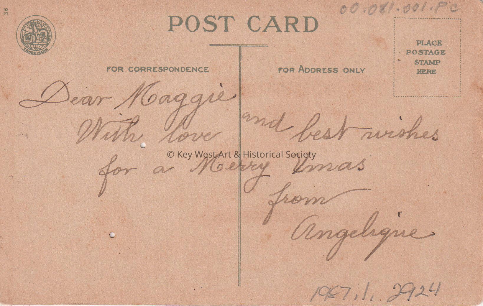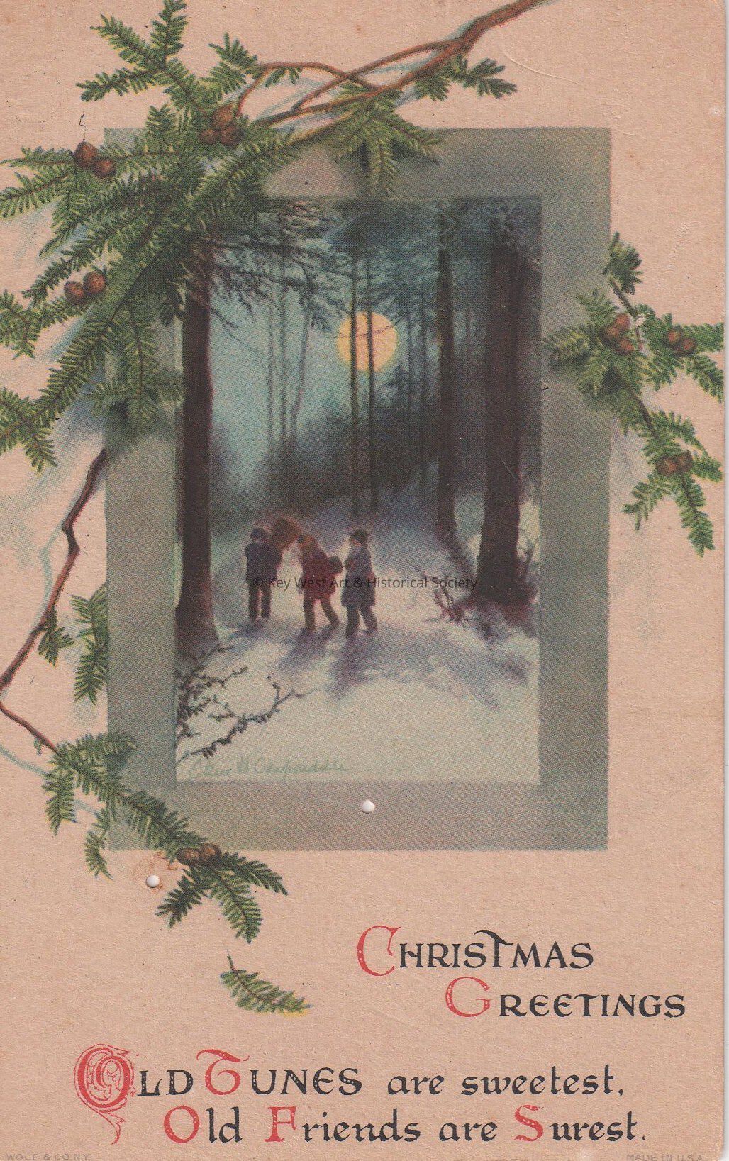 Postcard of fir branches around a painting of three people in a snow-covered, moonlit forest. The caption reads, ‘Christmas Greetings. Old tunes are sweetest, old friends are surest.’ The message on the verso reads, 'Dear Maggie, with love and best wishes for a Merry Christmas, from Angelique'.Collection