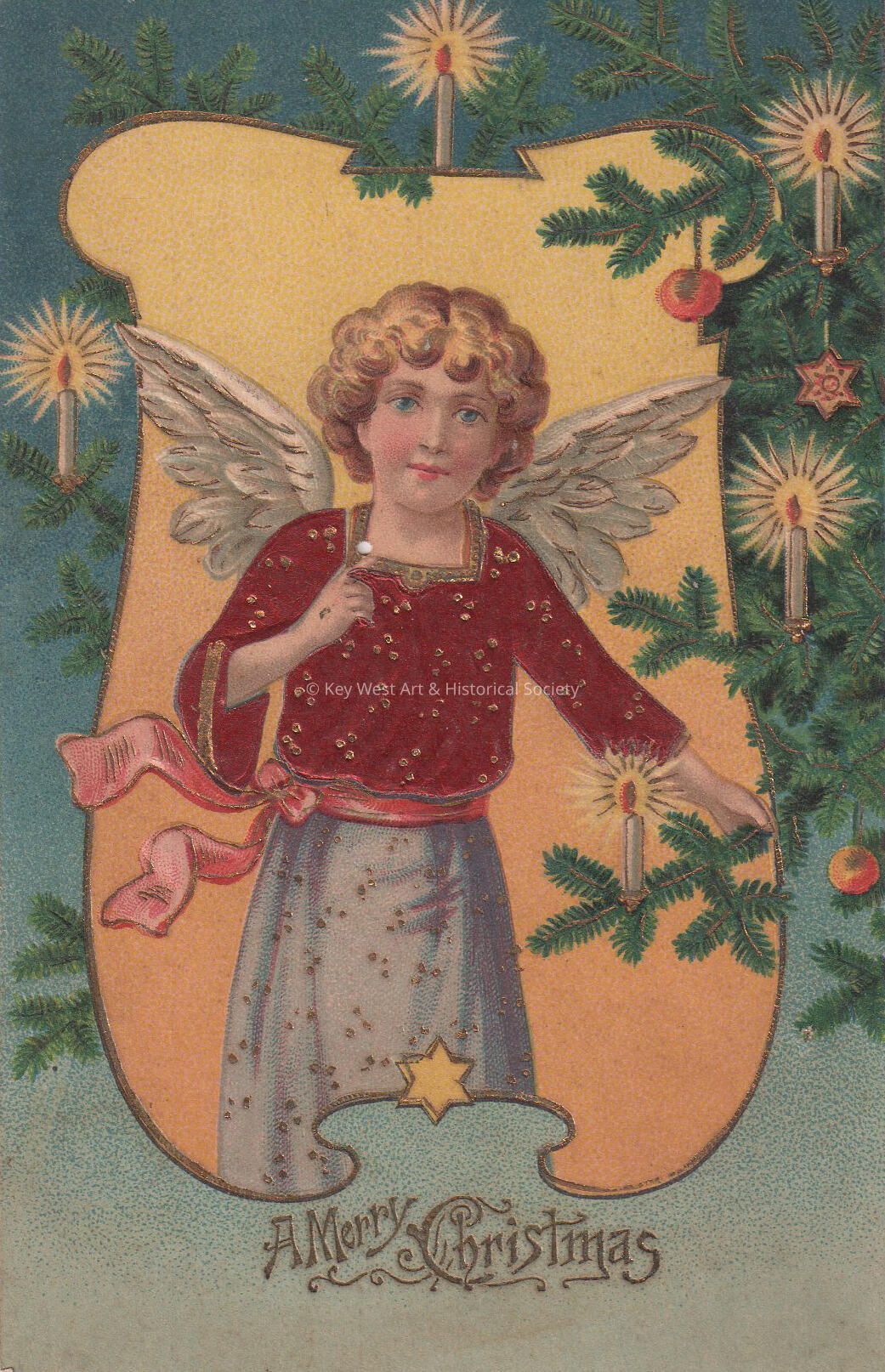 Postcard depicting an angel near a Christmas tree with candles. The caption reads, ‘A Merry Christmas’. The message on the verso reads, ‘To Carolyn for a Merry Christmas from Uncle Claude and Aunt Lill, 1909'.Collection
