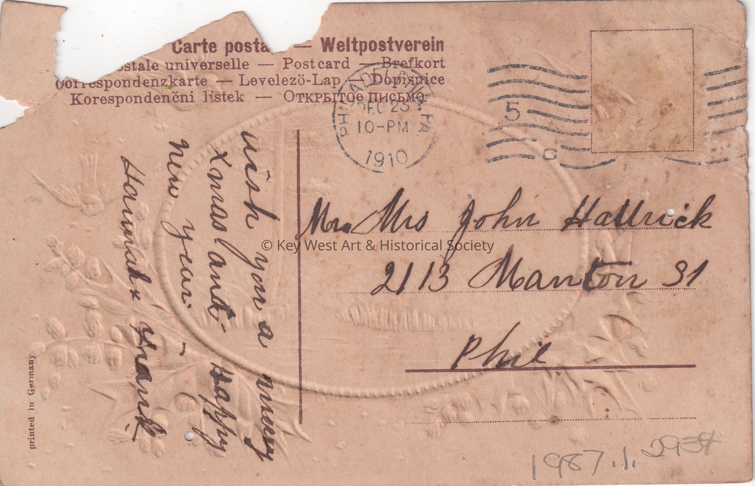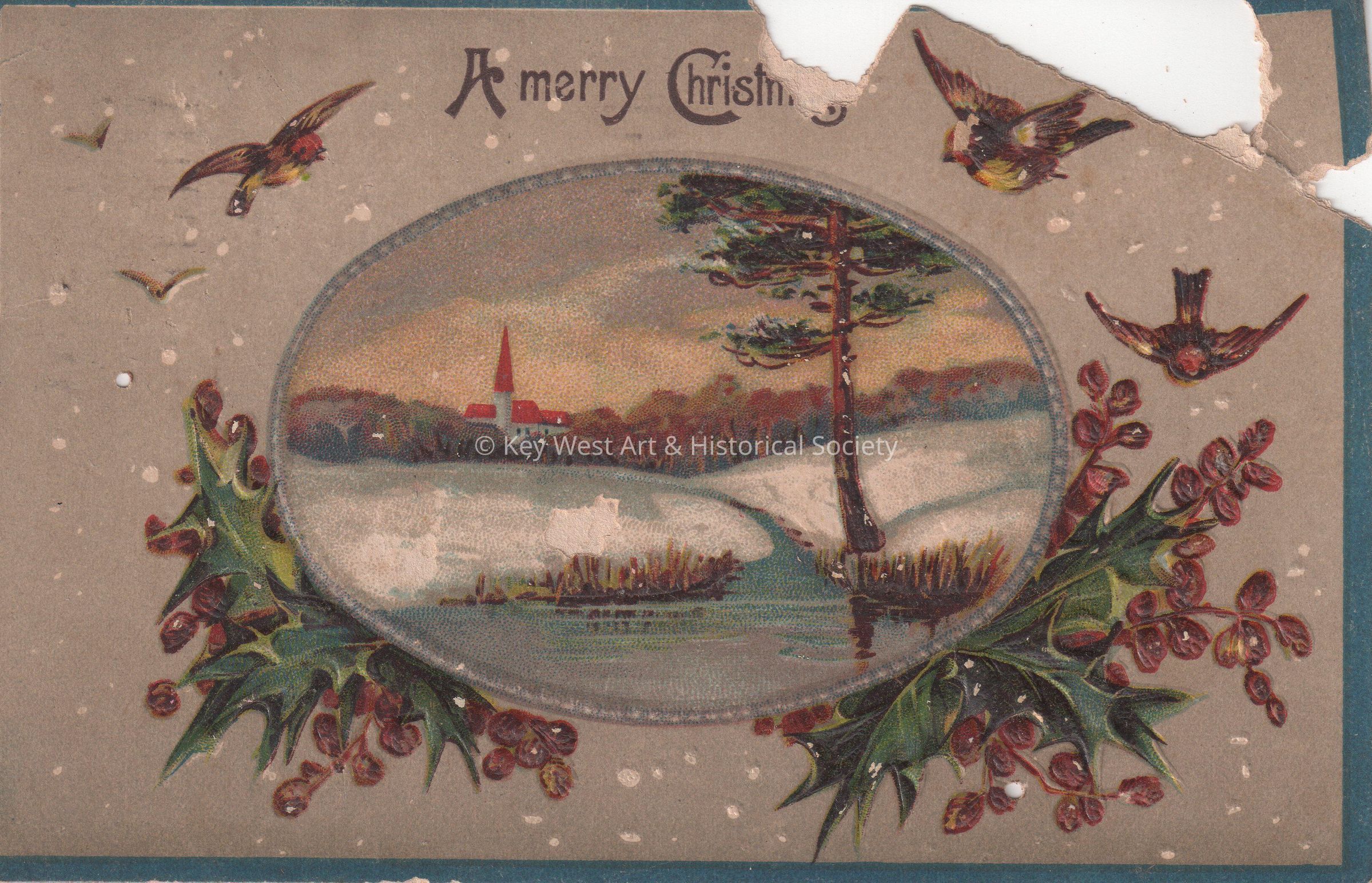 Postcard depicting birds and holly berries around a painting of a church. The caption reads, ‘A Merry Christmas’. The message on the verso reads, ‘Wish you a merry Christmas and Happy New Year. Hannah & Frank’. The card is addressed to Mr. and Mrs. John Hattrick, 2113 Manton Street, Philadelphia, Pennsylvania, and is postmarked Philadelphia, December 23, 1910.Collection