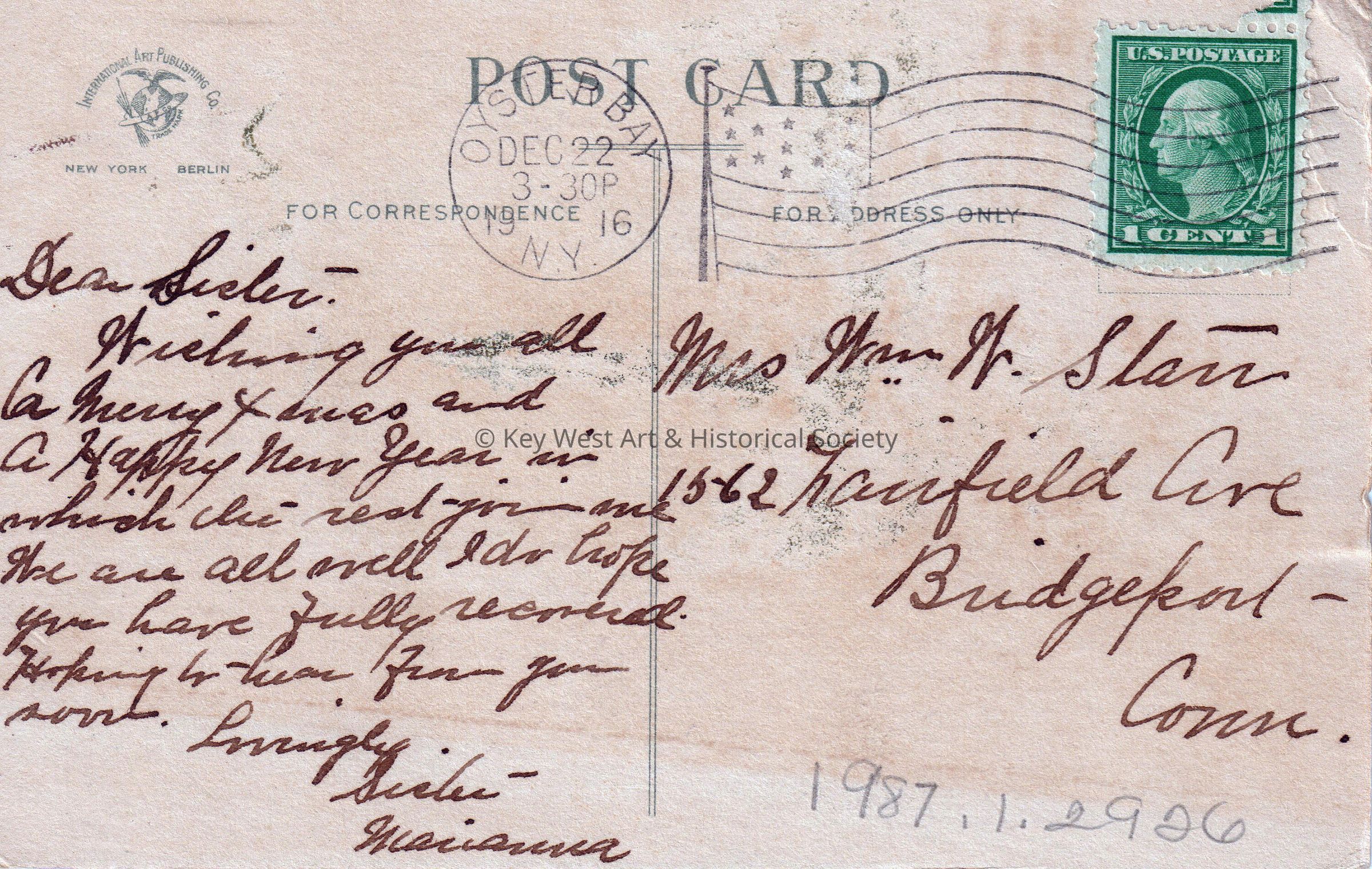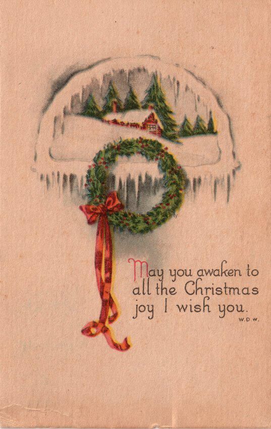 Postcard depicting a snow-covered house and a holly wreath. The caption reads, ‘May you awaken to all the Christmas joy I wish you. WDW’. The message on the verso reads, ‘Dear Sister, Wishing you all a Merry Christmas and a Happy New Year in which the rest you need. We are all well. I do hope you have fully recovered. Hoping to hear from you soon. Lovingly, Sister Marianna’. The card is addressed to Mrs. Wm. W. Starr, 1562 Fairfield Avenue, Bridgeport, Connecticut, and is postmarked December 22, 1916, Oyster Bay, New York.Collection