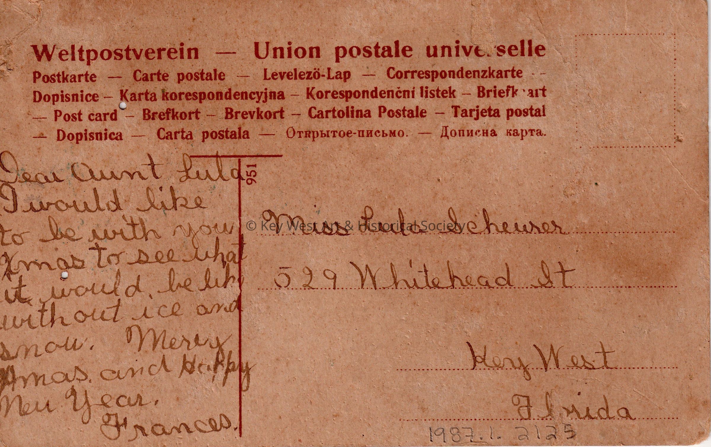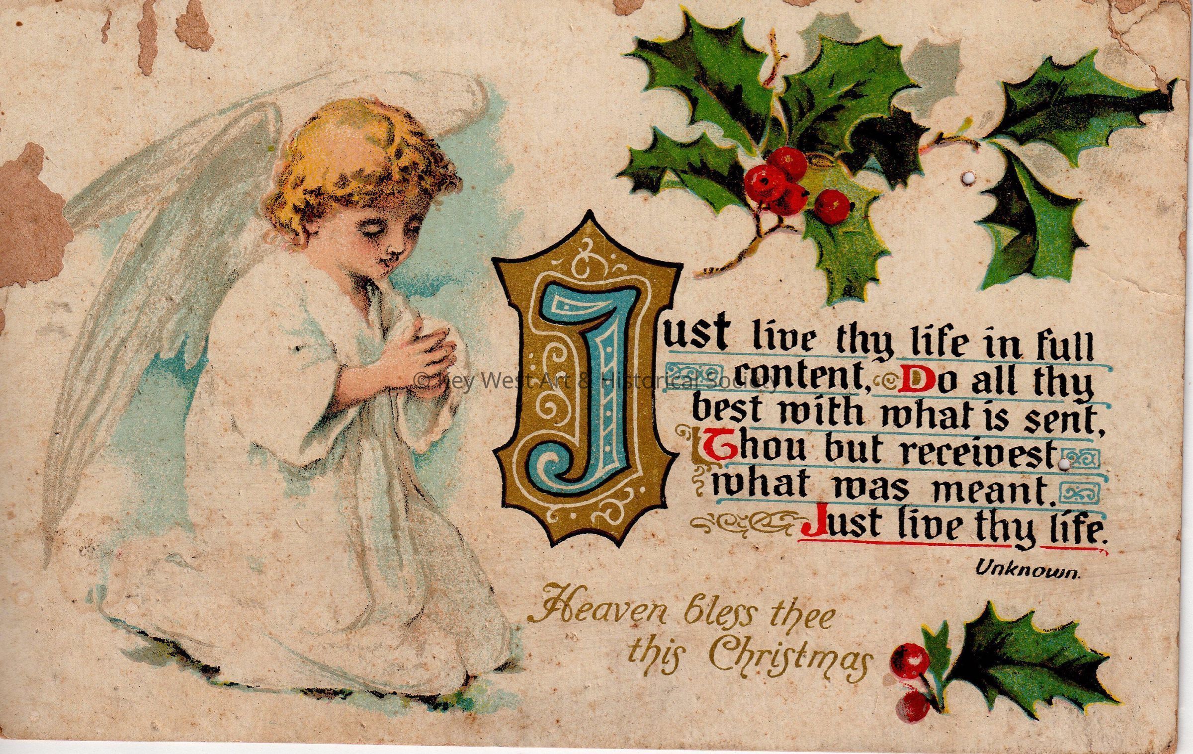 Postcard depicting an angel praying near holly sprigs. The caption reads, ‘Heaven Bless thee this Christmas – Just live thy life in full content, Do all thy best with what is sent, Thou but receivest what was meant, Just live thy life (unknown).’ The message on the verso reads, ‘Dear Aunt Lula, I would like to be with you Christmas to see what it would be like without ice and snow. Merry Christmas and Happy New Year. Frances.’ The card is addressed to Miss Lula Scheurer, 529 Whitehead Street, Key West, Florida.Collection