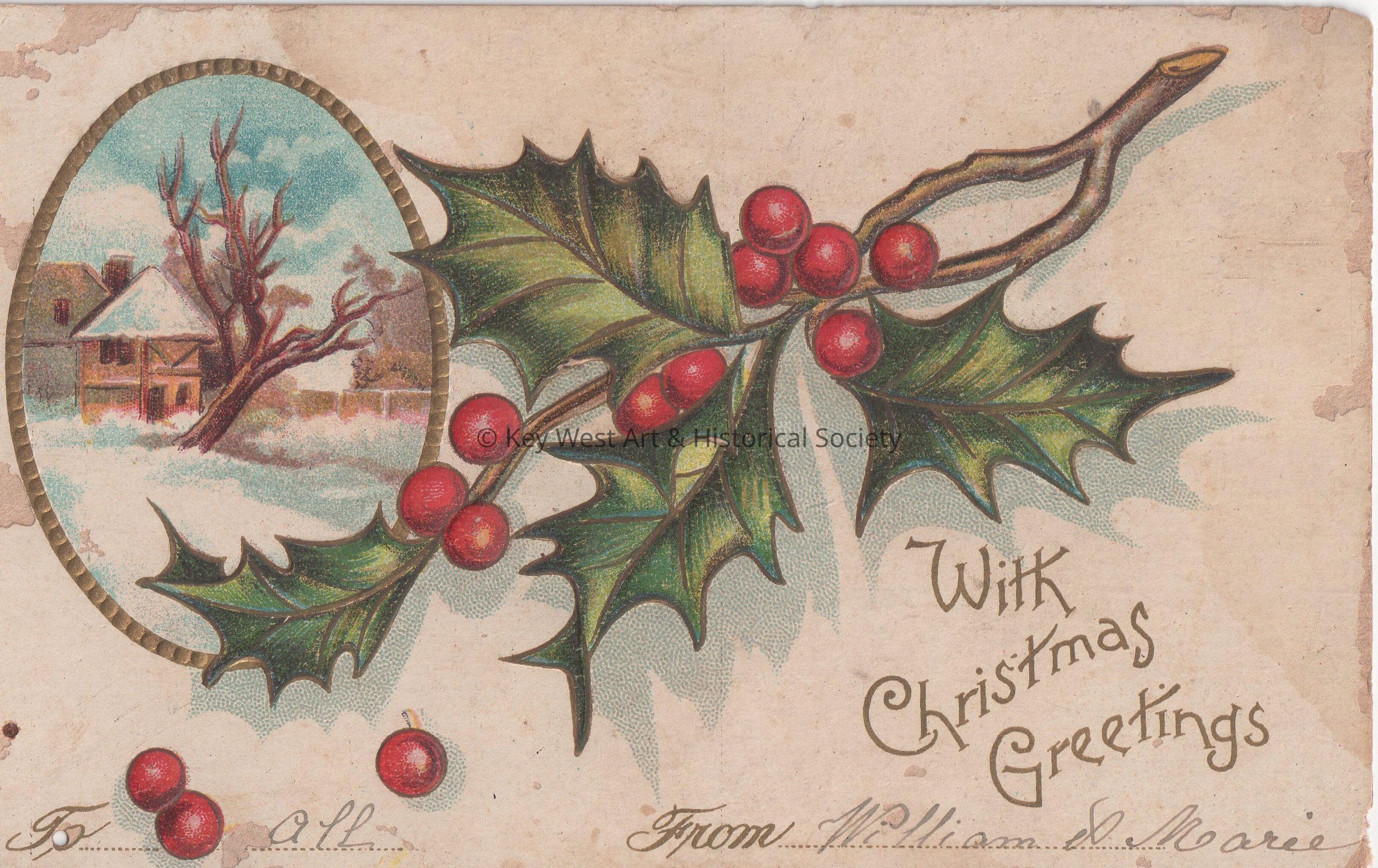 Postcard depicting a sprig of holly near a painting of a snow-covered house. The caption reads, ‘With Christmas Greetings. To “Otto” From “William & Marie”.’Collection