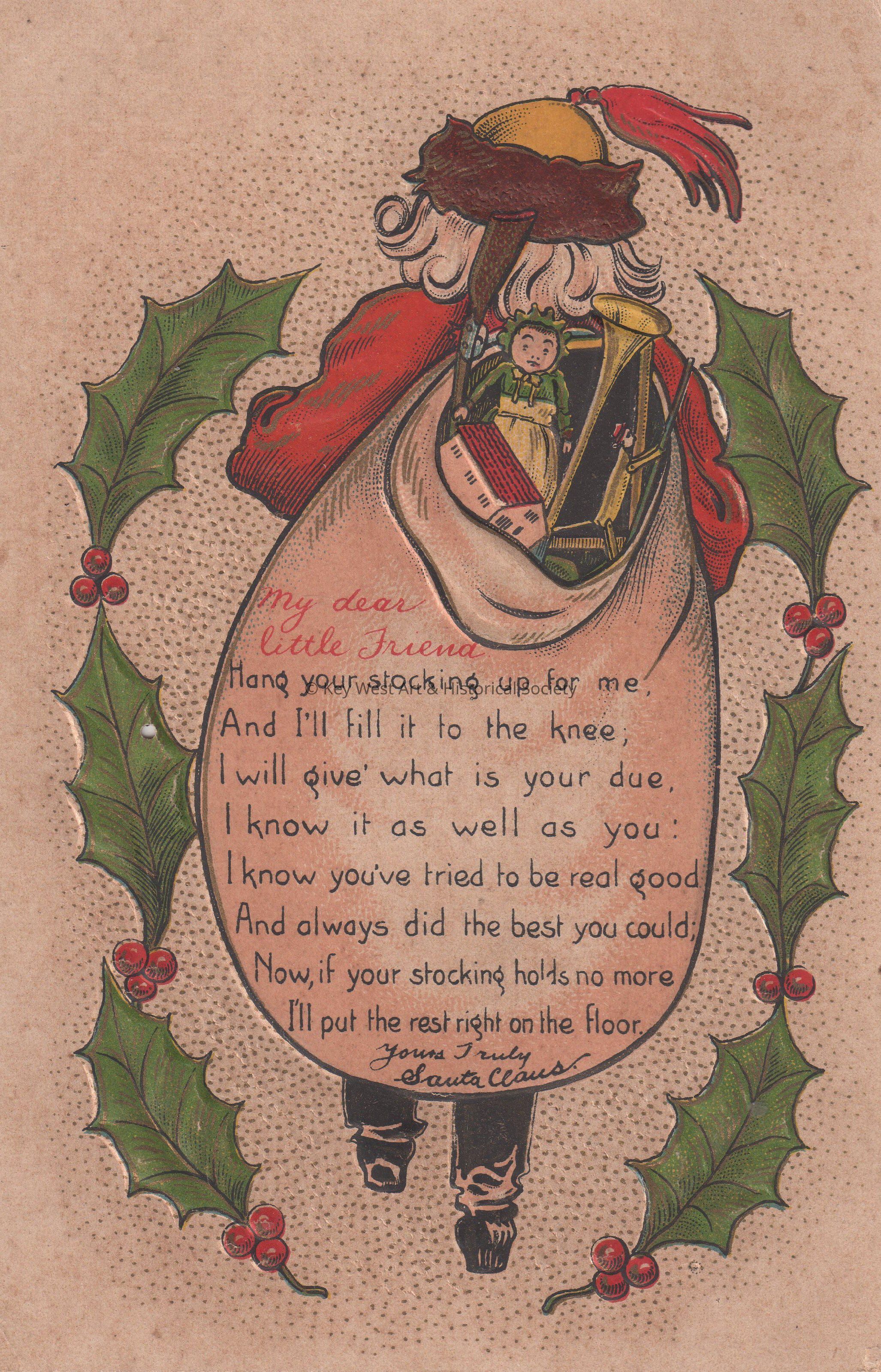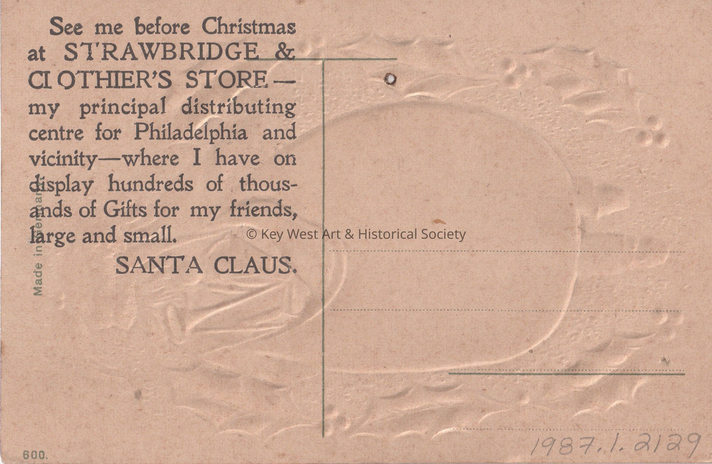 Postcard depicting holly sprigs and Santa Claus with a bag full of toys. The caption reads, ‘My dear little Friend, Hang your stocking up for me, And I’ll fill it to the knee. I will give what is your due. I know it as well as you. I know you’ve tried to be real good, And always did the best you could, Now, if your stocking holds no more, I’ll put the rest right on the floor. Yours truly, Santa Claus.’ The description on the verso reads, ‘See me before Christmas at Strawbridge & Clothier’s Store – my principal distributing centre for Philadelphia and vicinity—where I have on display hundreds of thousands of Gifts for my friends, large and small. Santa Claus.’Collection