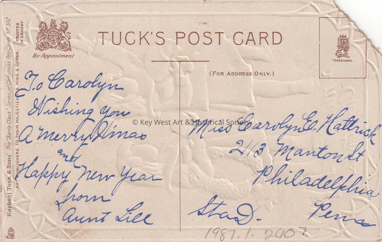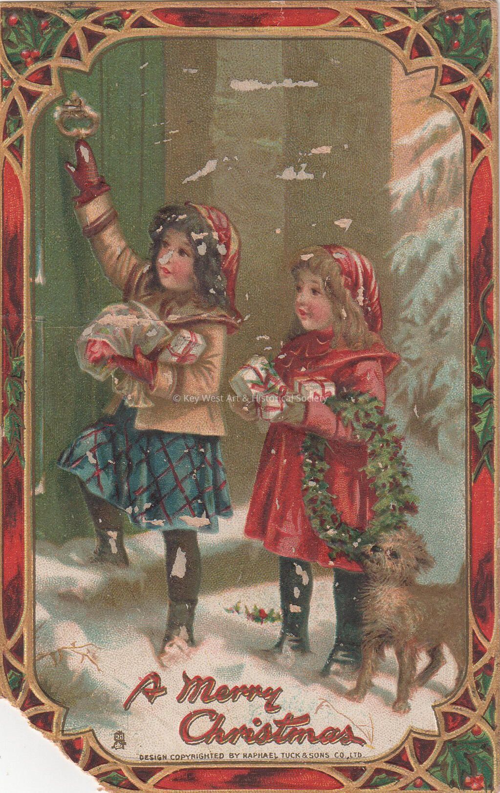 Postcard depicting two girls and a dog with Christmas presents and a wreath preparing to knock on a door. The caption reads, ‘A Merry Christmas’. The message on the verso reads, ‘To Carolyn, wishing you a Merry Christmas and a Happy New Year from Aunt Lill'. The card is addressed to Miss Carolyn E. Hattrick, 2113 Manton Street, Station D, Philadelphia, Pennsylvania.Collection