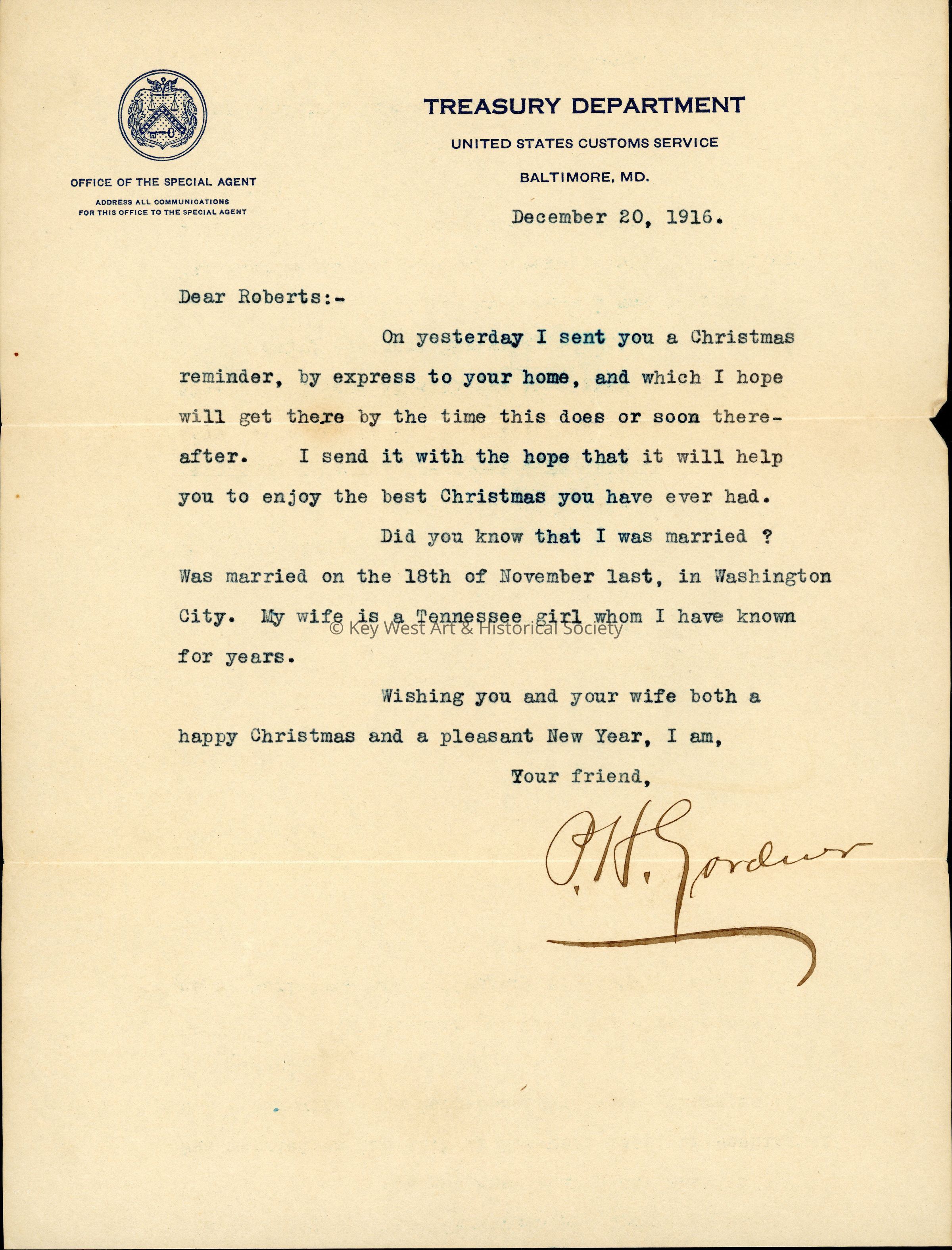 A Christmas letter from P.H. Gardener to James A. Roberts. The letter is typed on Treasury Department United States Customs Service stationery.Collection