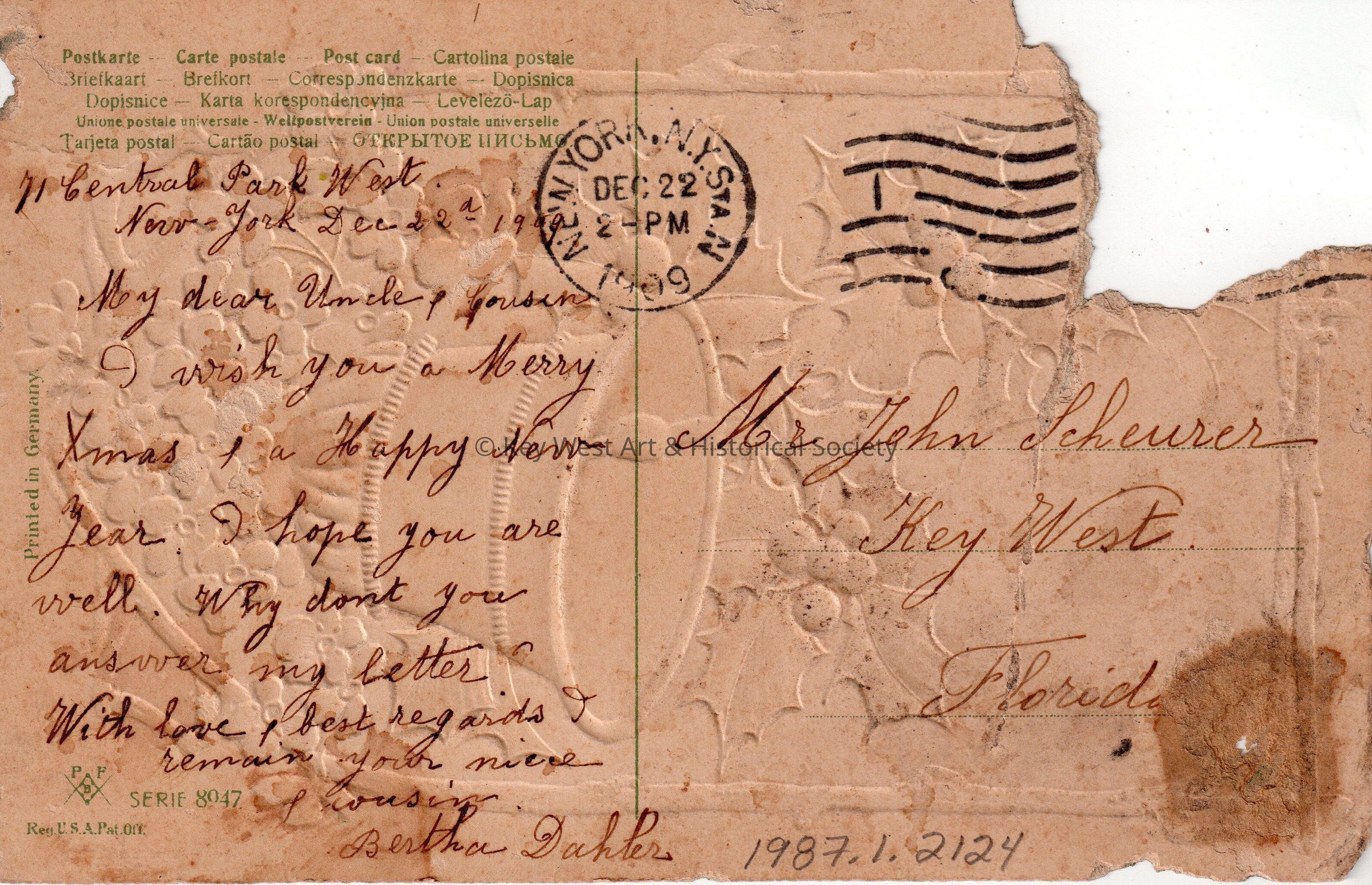 Postcard depicting a bell, holly sprigs, and flowers. The caption reads, ‘All Good Wishes for Christmas’. The message on the verso reads, ‘71 Central Park West, New York, December 22, 1909, My dear Uncle and cousin, I wish you a Merry Christmas & a Happy New Year. I hope you are well. Why don’t you answer my letter? With love & best regards, I remain your niece and cousin, Bertha Dahler.’ The card is addressed to Mr. John Scheurer, Key West, Florida, and is postmarked New York, New York, December 22, 1909.Collection