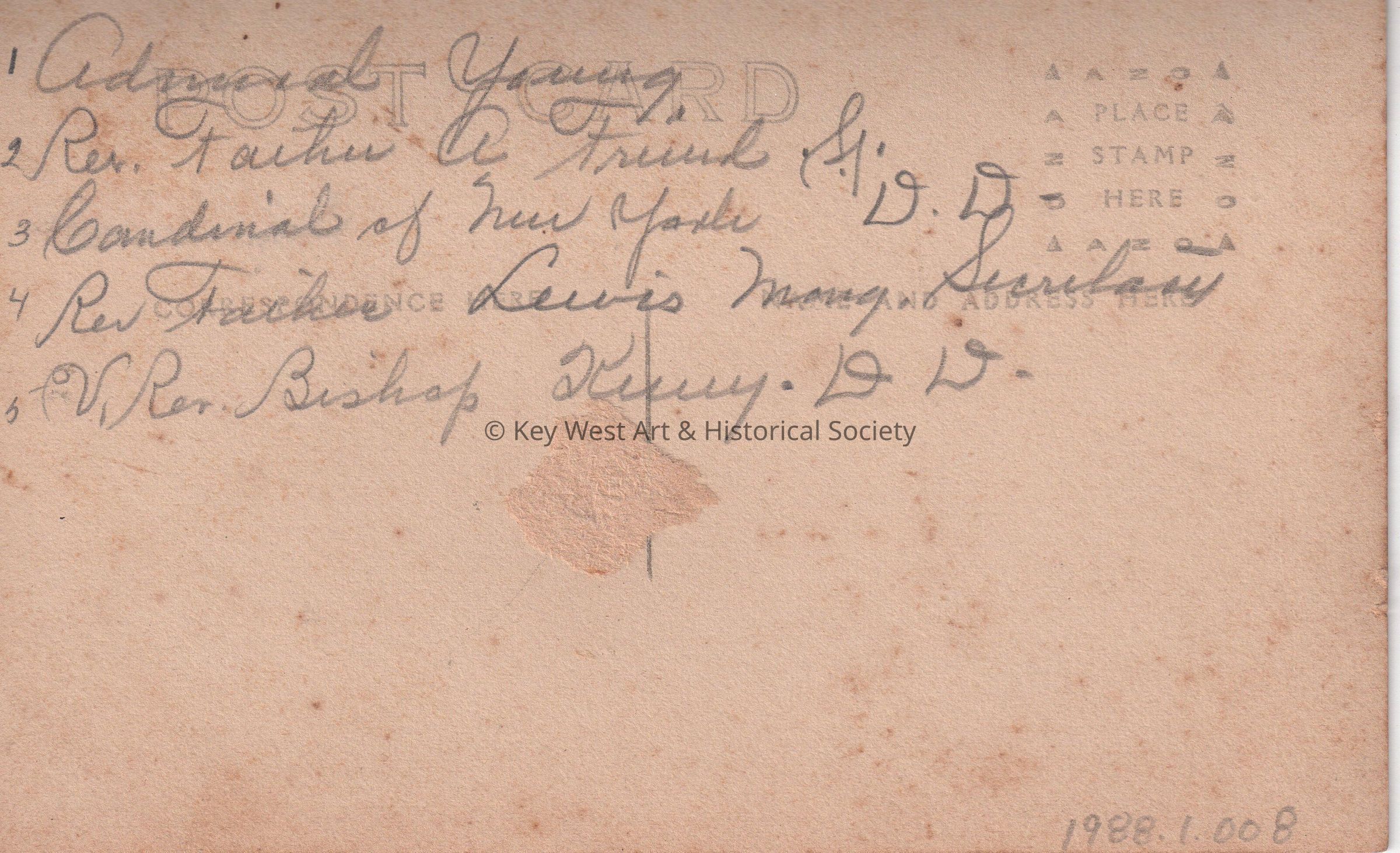 Postcard depicting bishops and priests. The caption reads, ‘Convent Grounds, Key West, Florida.’ The message on the verso identifies the men as (right to left), ‘1. Admiral Young; 2. Rev. Father A. Friend, Sr.; 3. Cardinal of New York, D.D.; 4. Rev. Father Lewis Many Sicrilau; 5. V. Rev. Bishop Kenny, D.D.’Collection