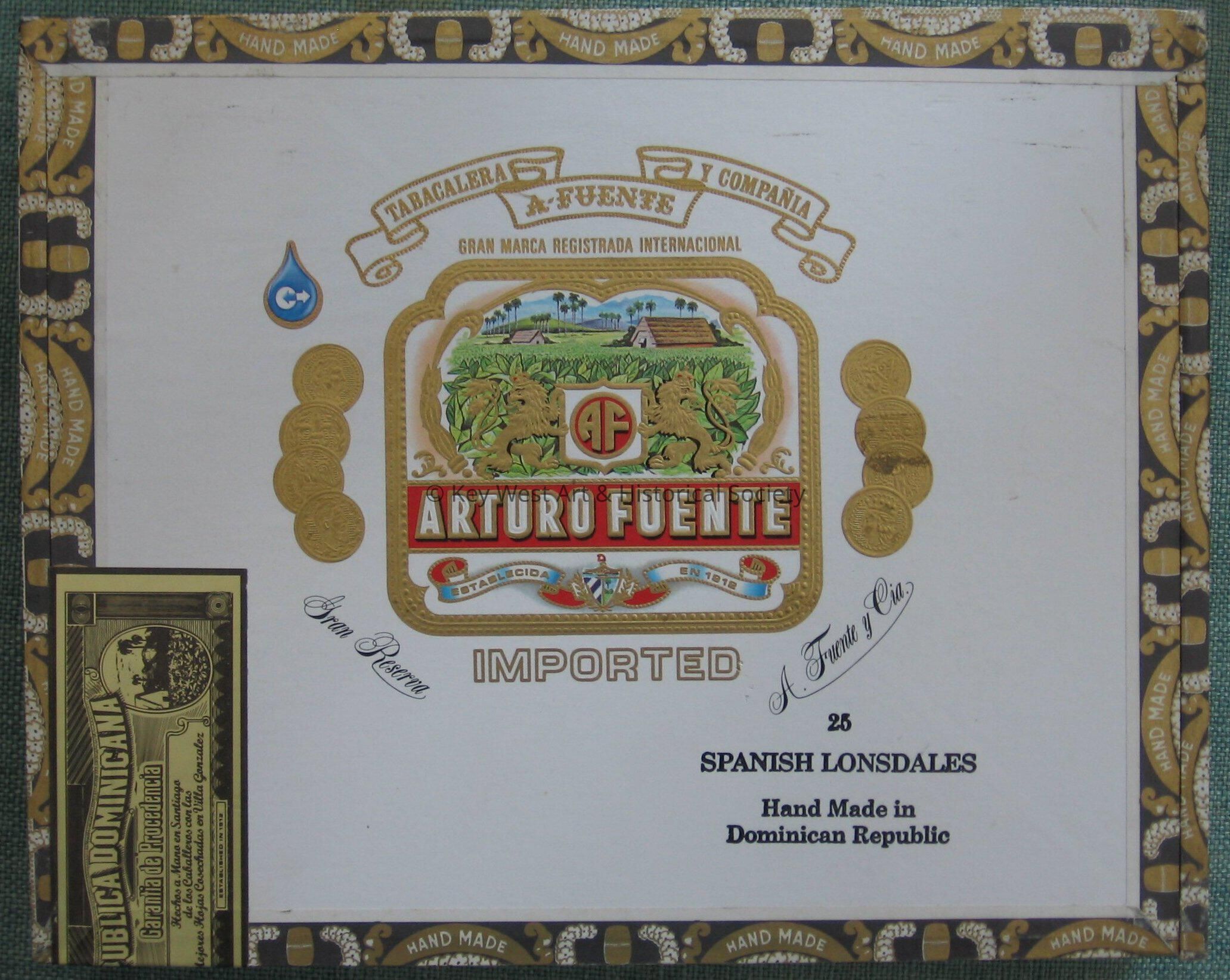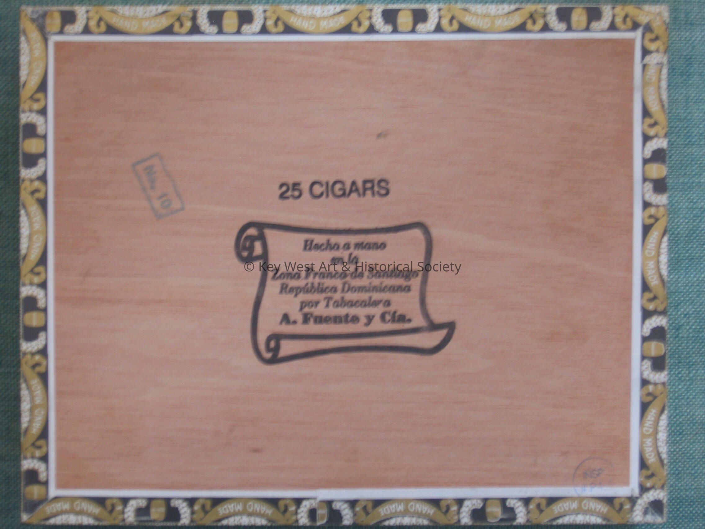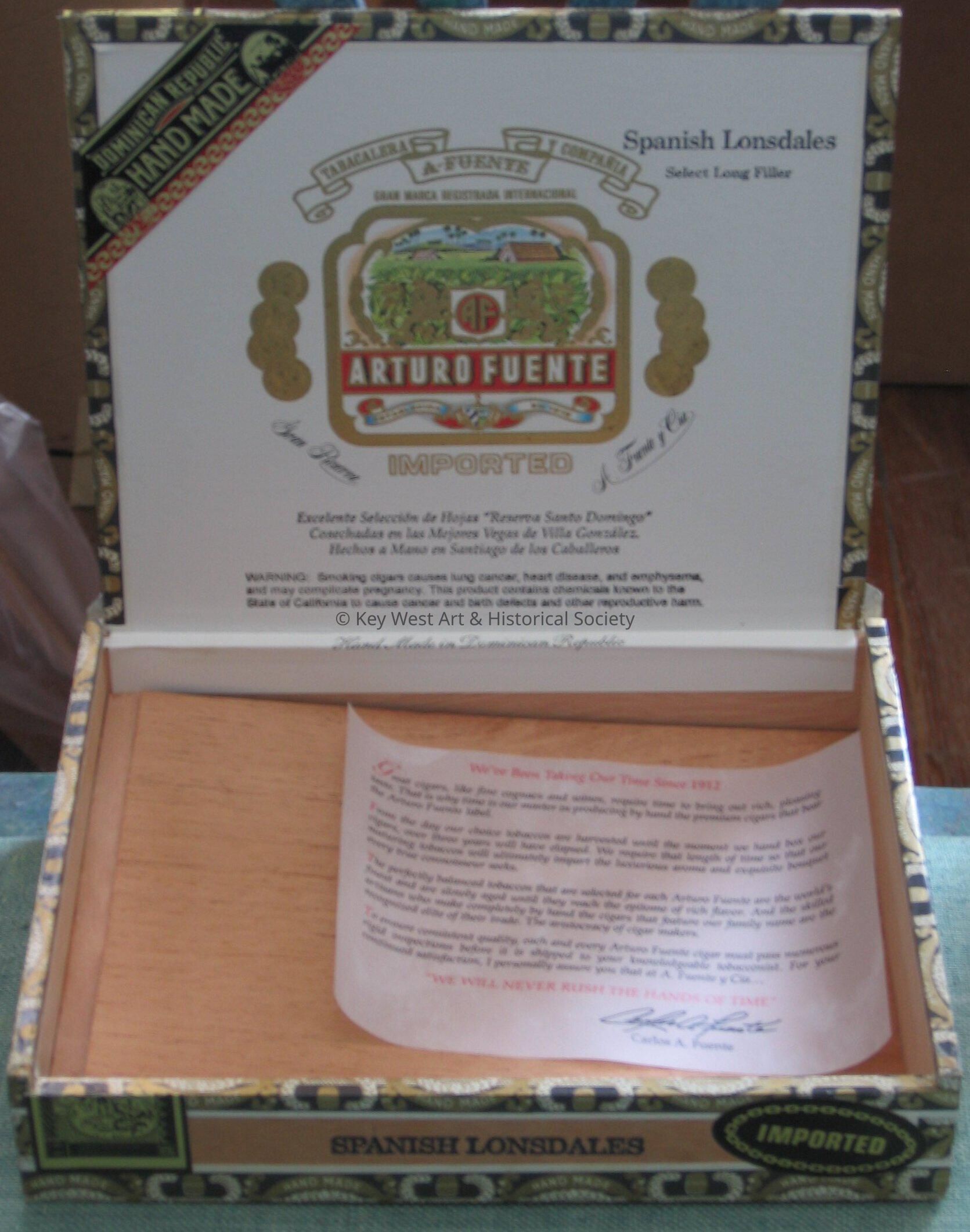 Wood cigar box made by Arturo Fuente. Box reads "Tabacalera y Comania" "Arturo Fuente". Inside box is note from Carlos A. Fuente.
